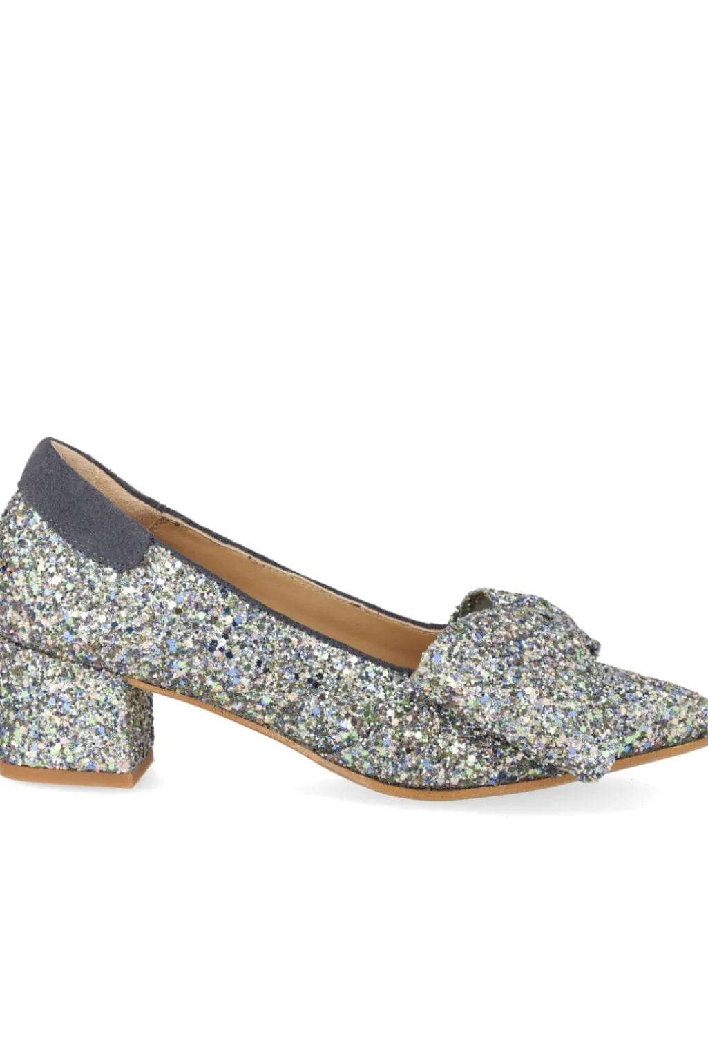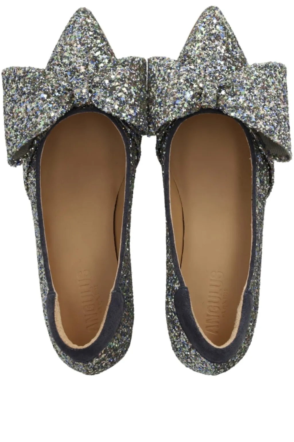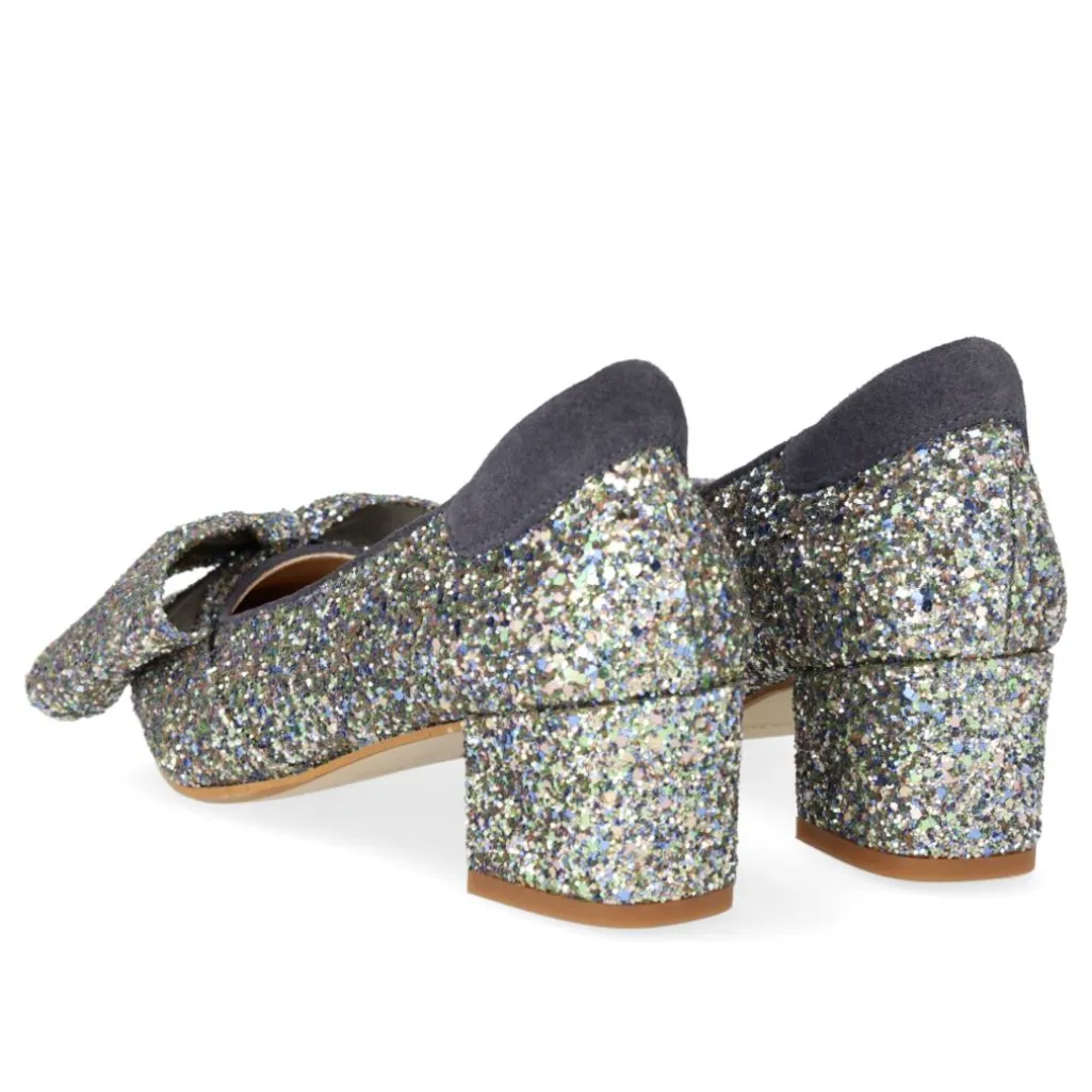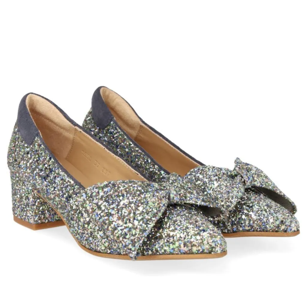 Sko fra Angulus med multifarvet glitteroverflade og indigo-detaljer. En sløjfe pryder den spidse tå, og blokhælen giver god støtte til både hverdag og fest.