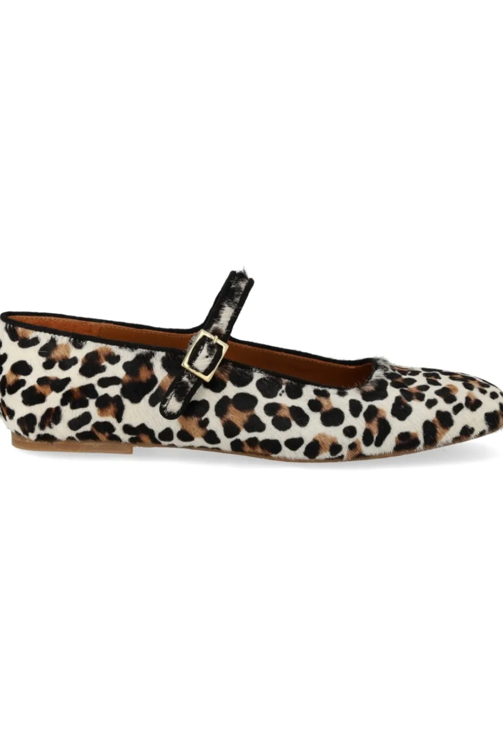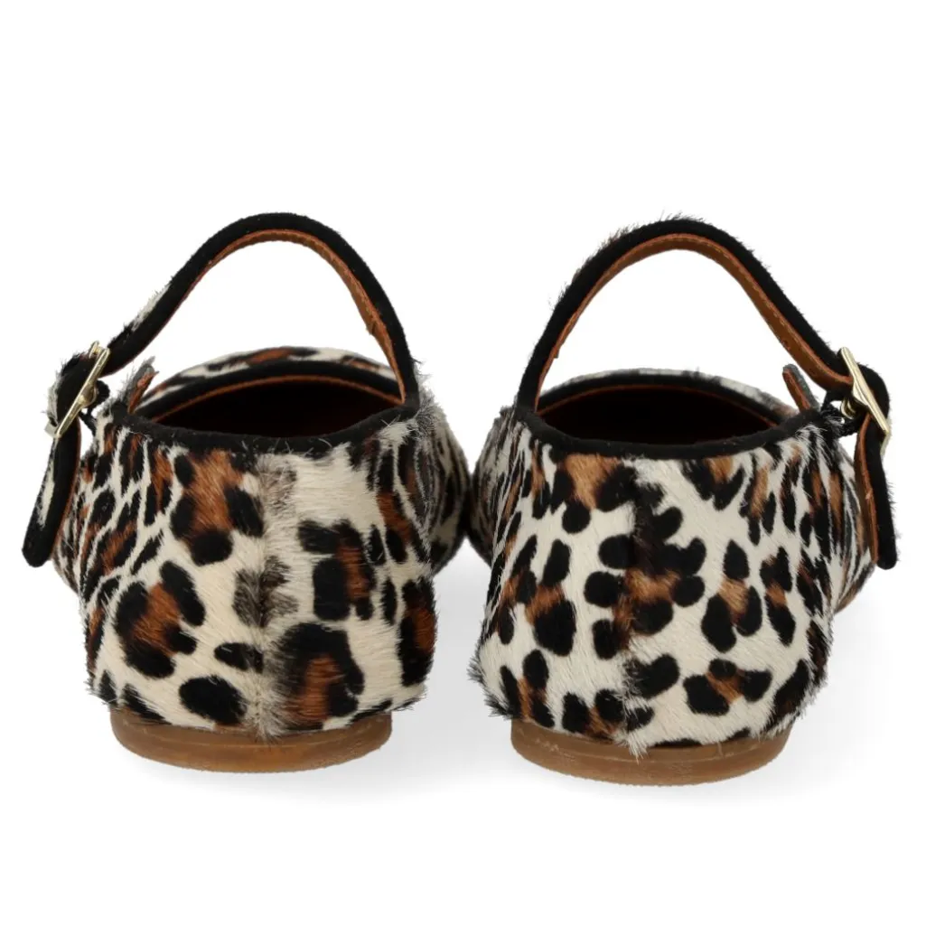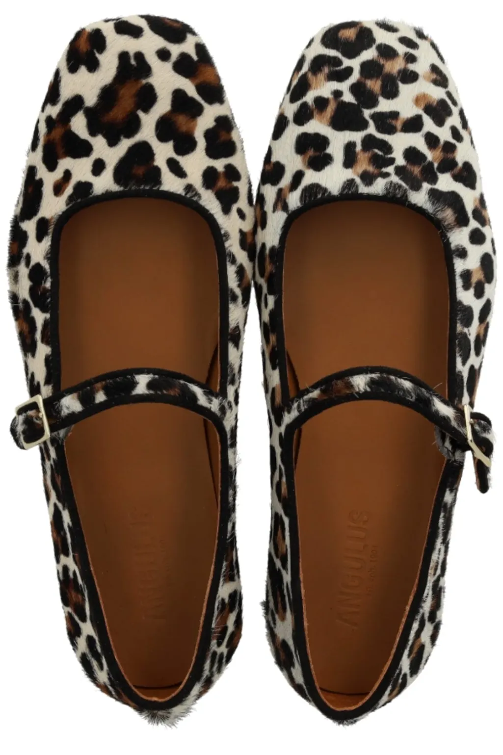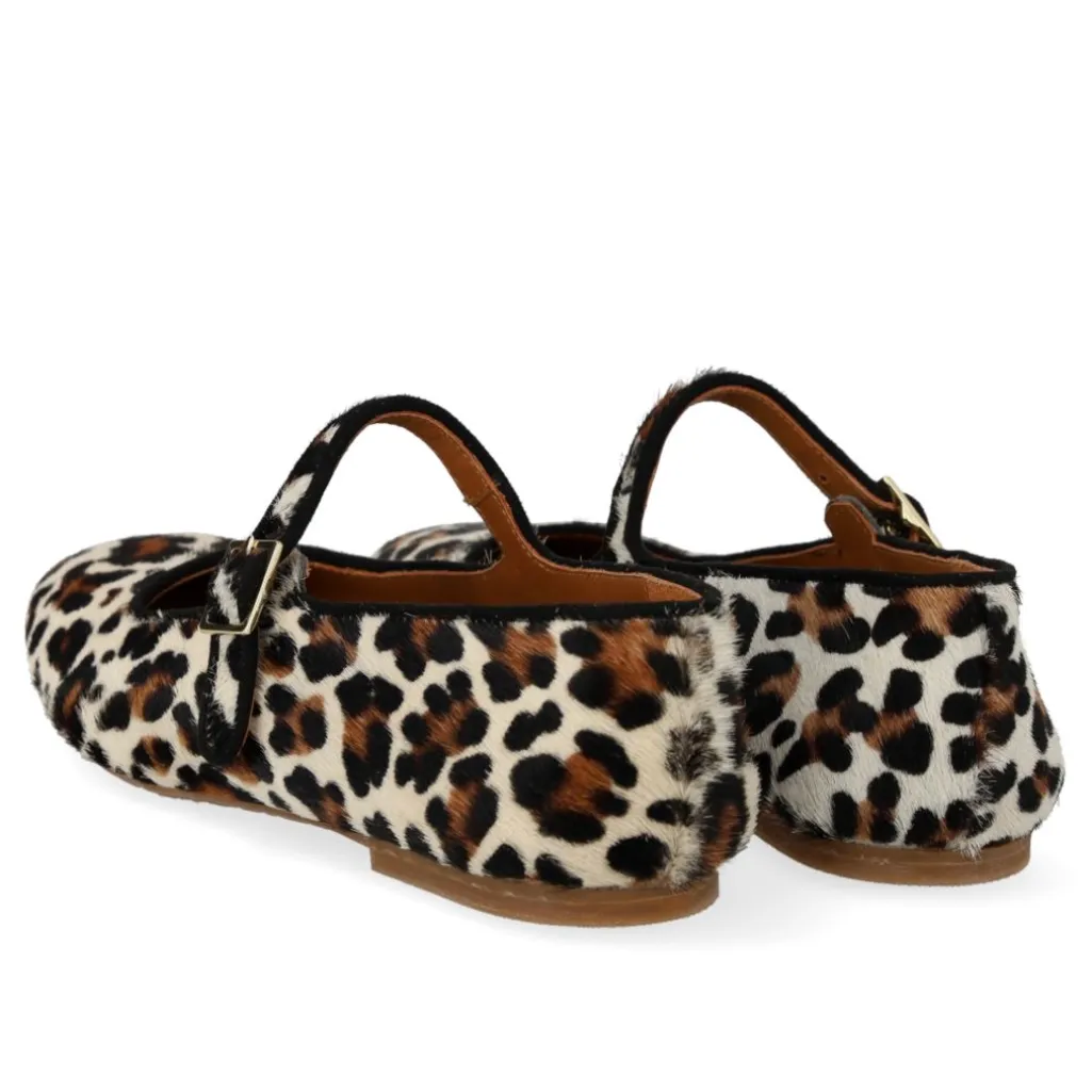 Ballerinaer fra Angulus med leopardmønster og sorte detaljer. Skoene har en rund tå og spænde-lukning over vristen, der giver god tilpasning til foden.