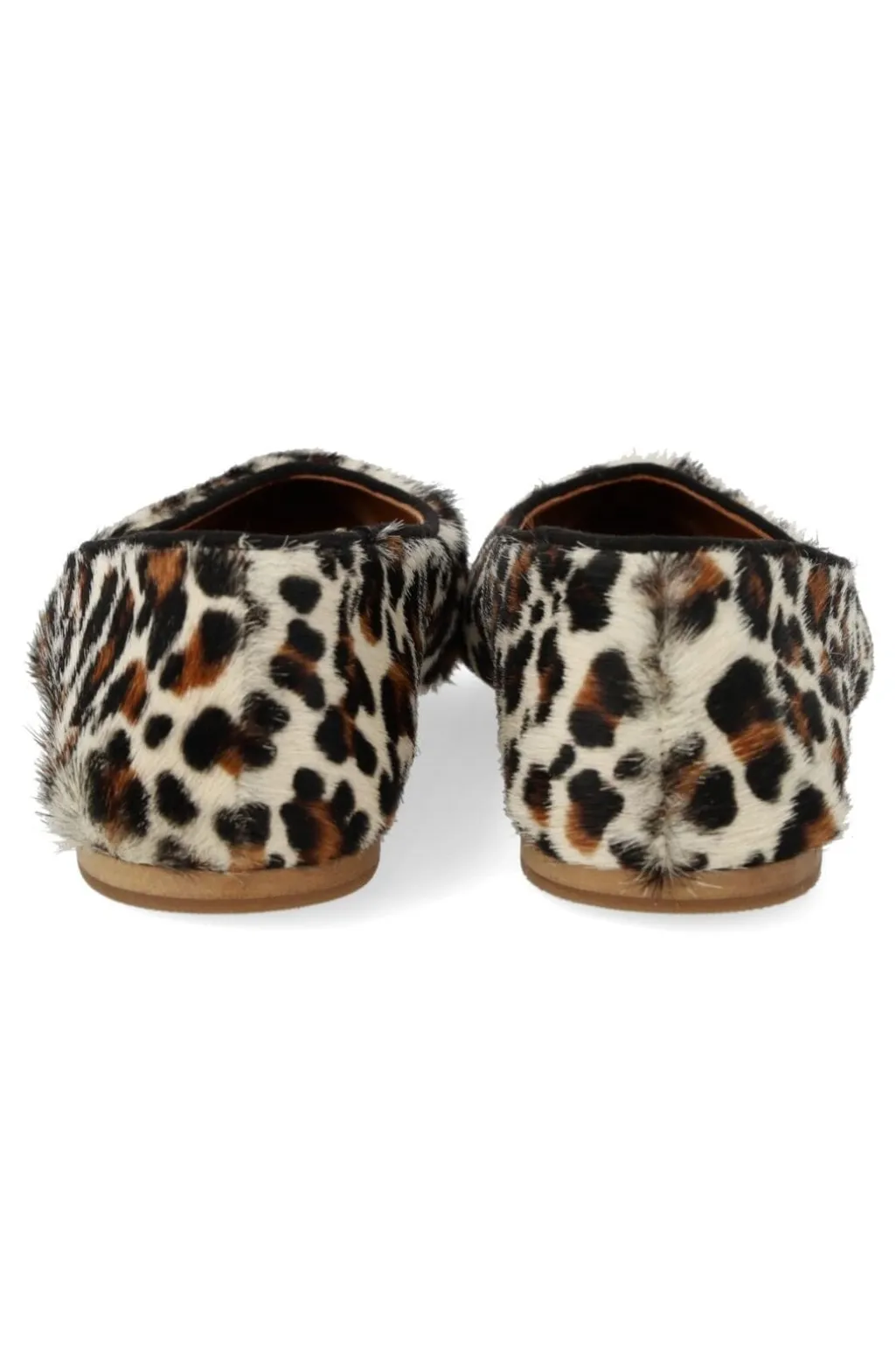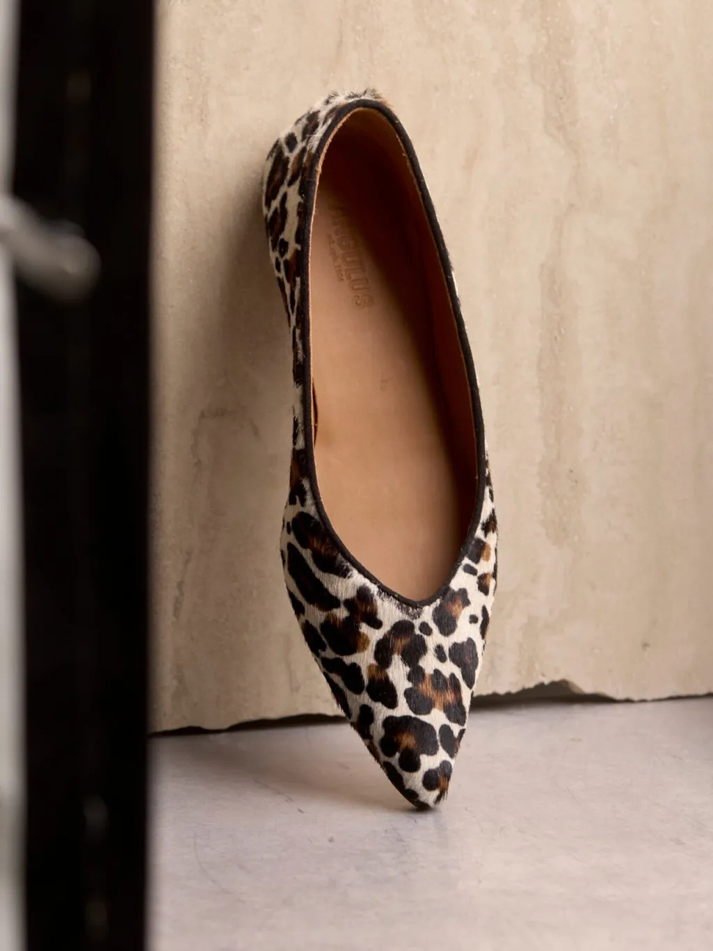 Ballerina fra Angulus med leopardmønstret ponyhår og sorte ruskindskanter. Skoen har spids tå og en lav hæl, kombineret med en let og fleksibel gummisål.