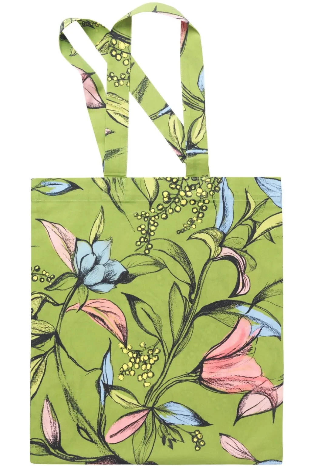 Tote bag fra Stine Goya med et kunstnerisk blomstermønster. Den grønne baggrund har detaljer i pink og blå, og brandet står i lyserød skrift på forsiden.