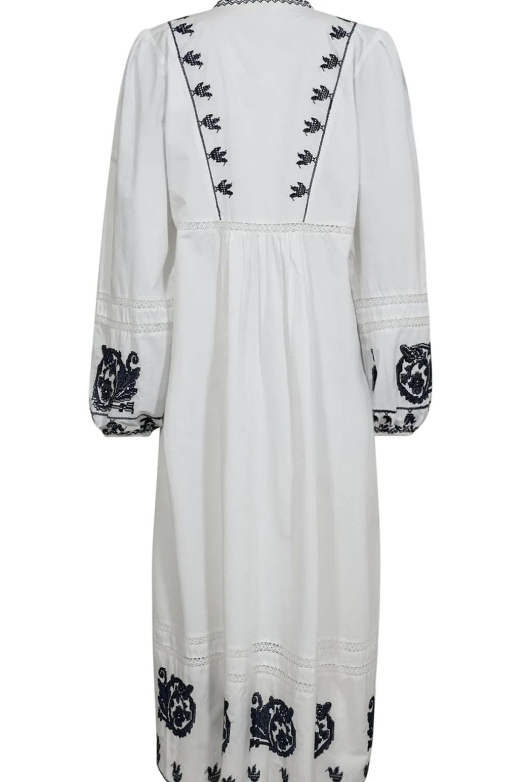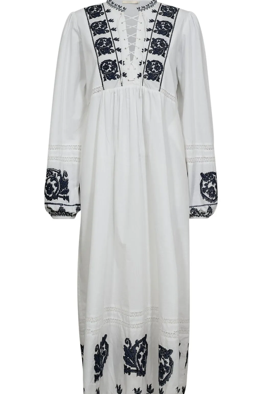 Hvid bomuldskjole fra Gossia med blå broderier. Kjolen har v-hals, lange ærmer og går til midt på læggen. De fine broderier pryder både ærmerne og kanten.
