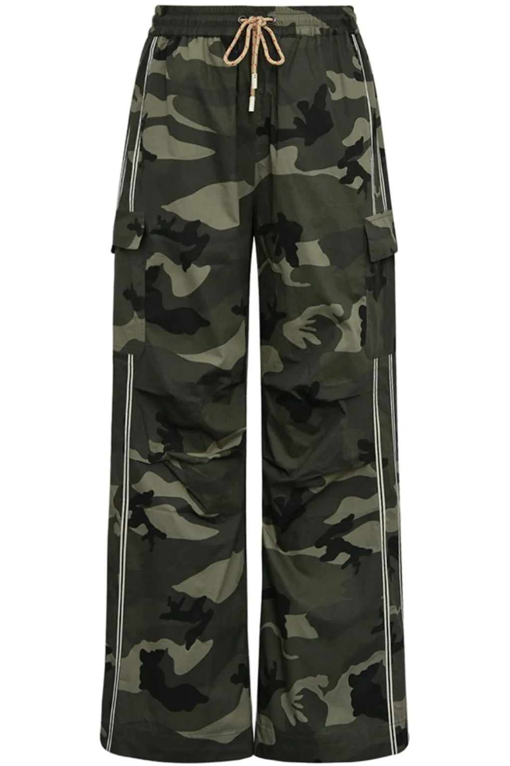 Bukser fra Gossia i army camouflage-mønster. De ankellange bukser har en regular fit med snøredetaljer og dekorative syninger.