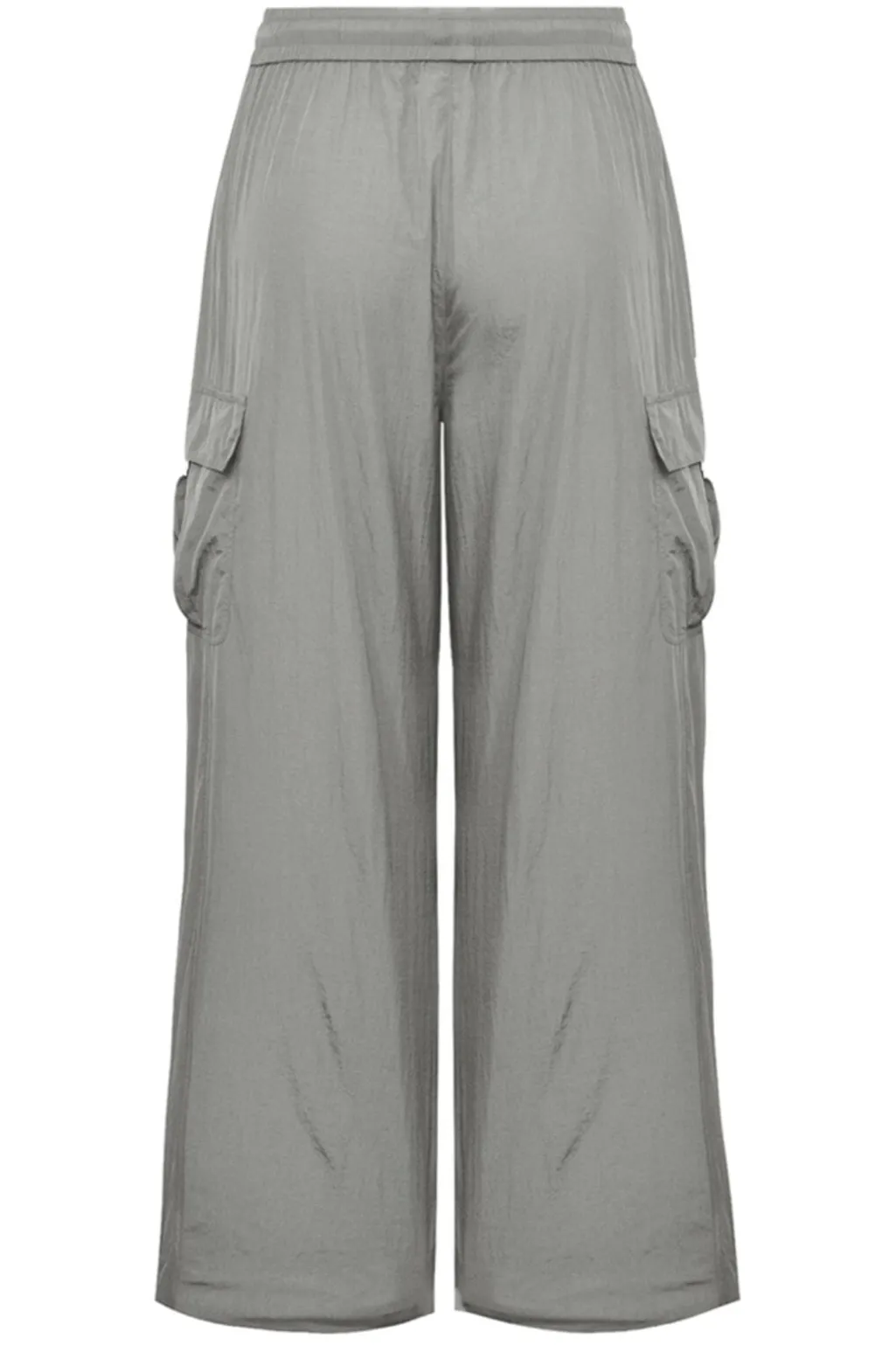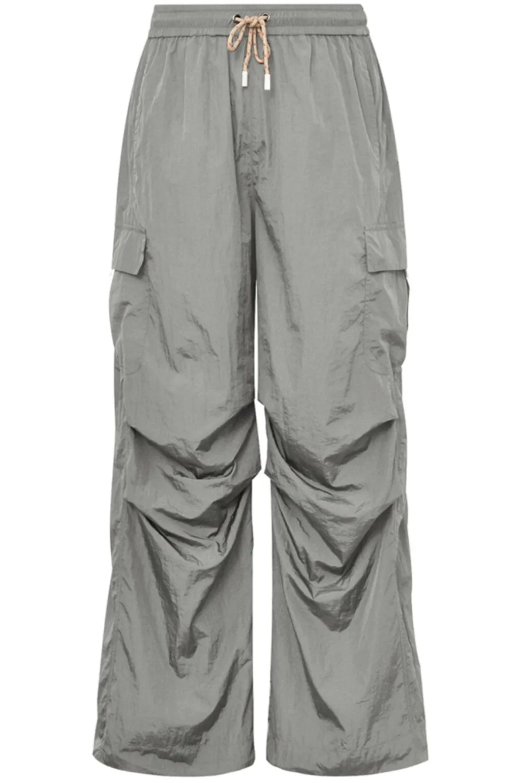 Grå bukser fra Gossia med cargo-lommer og snøre ved taljen og anklerne. Bukserne har en løs pasform og flæsedetaljer, der giver et afslappet udtryk.