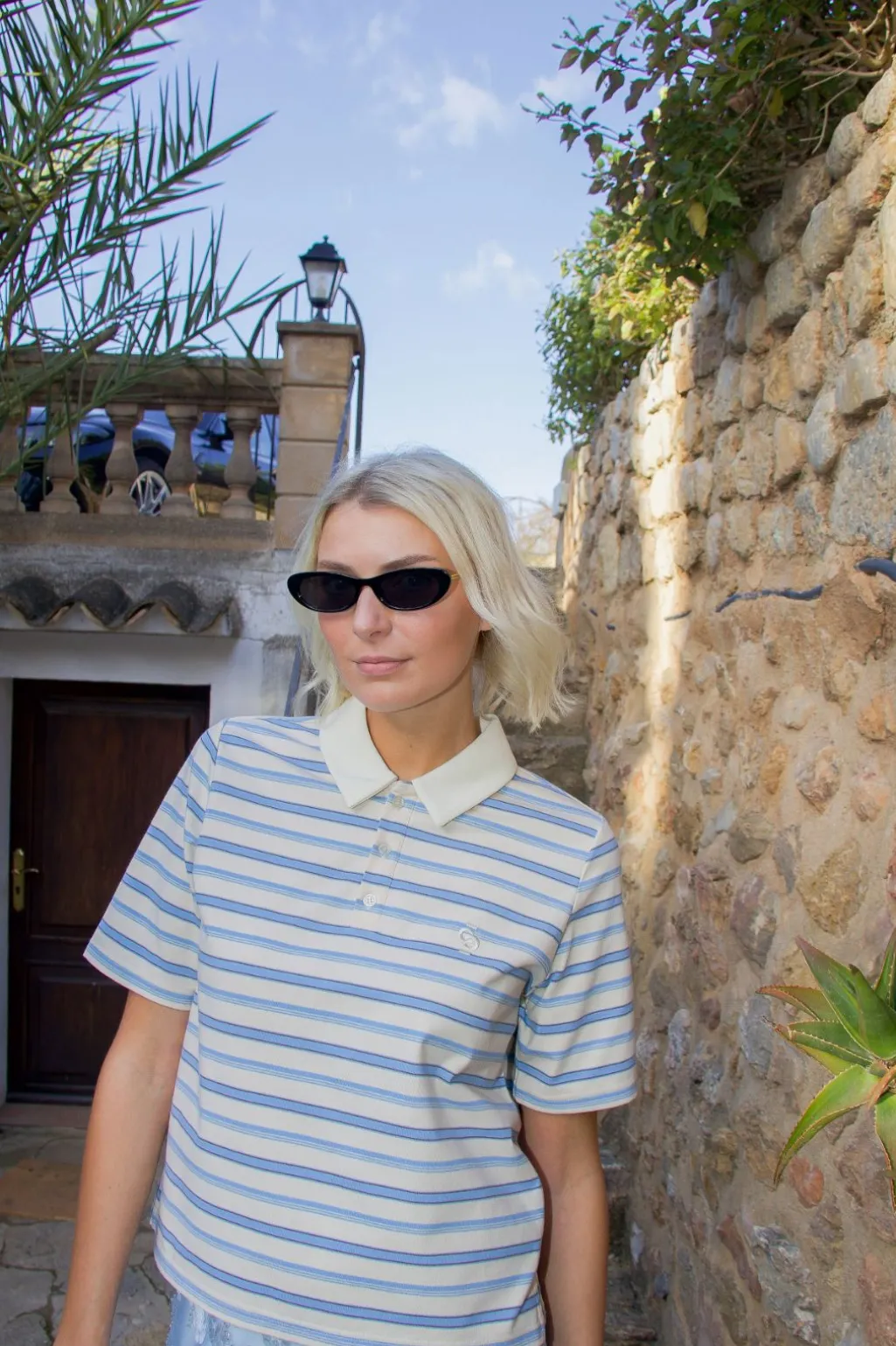 Stribet bluse fra Cras med polokrave og korte ærmer. De lyseblå og cremefarvede striber skaber et harmonisk udtryk, mens det broderede logo på brystet giver et diskret præg.