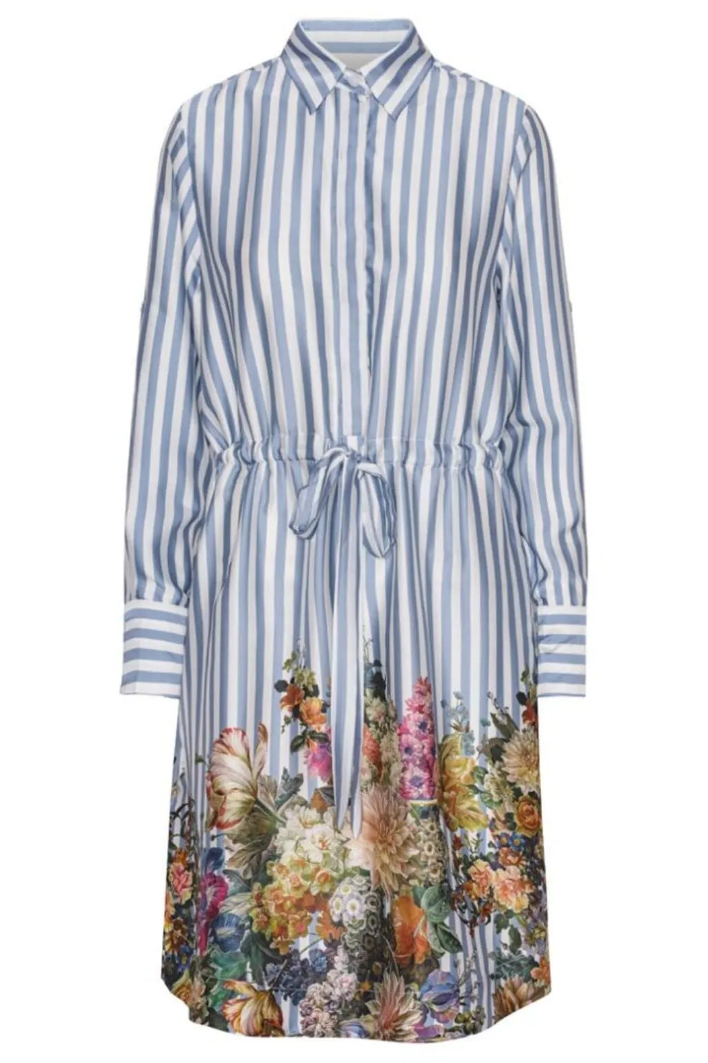 Skjortekjole med blå og hvide striber på overdelen og et farverigt blomstermønster forneden. Kjolen har snøring i taljen og lange ærmer med skjortekrave.