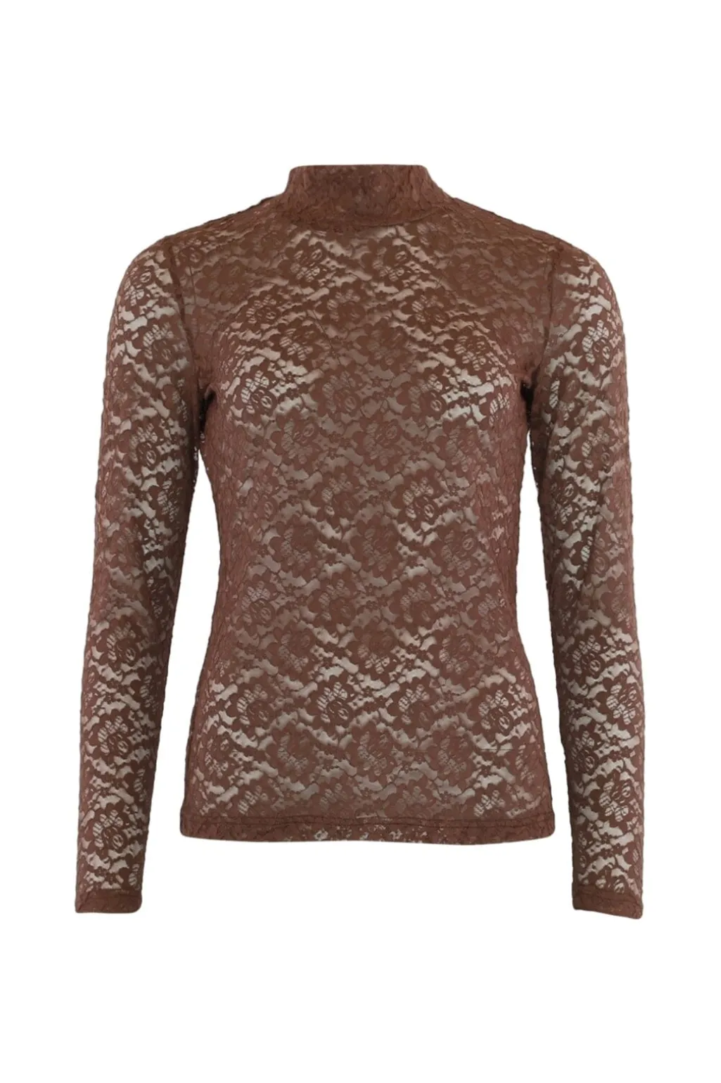 Brun blondebluse fra Continue med høj halsudskæring og lange ærmer. Blusen har et blomstermønster i blonden og en slim fit-pasform, der følger kroppens linjer.