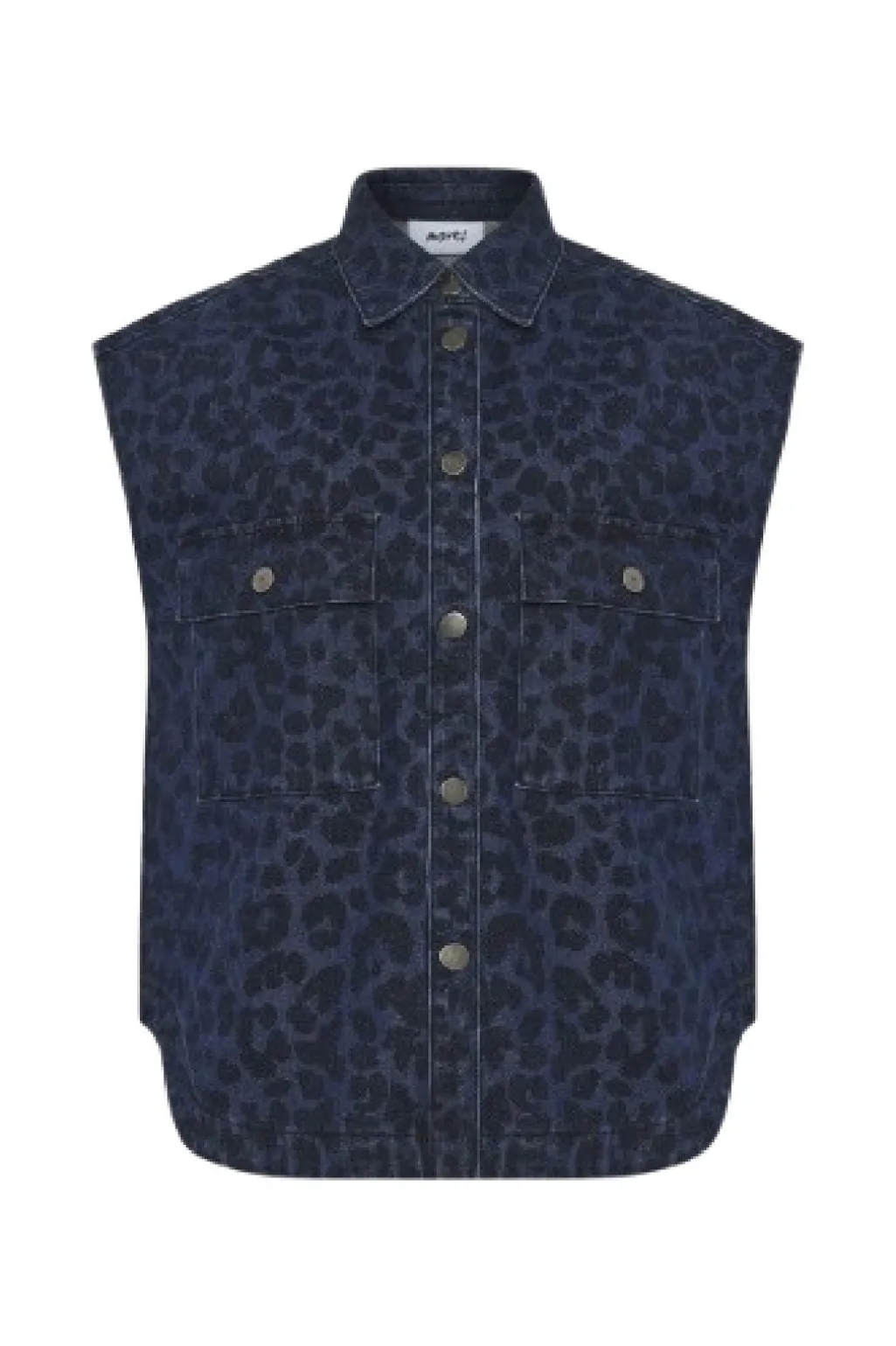 Mørkeblå vest fra Moves by Minimum med leopardprint. Vesten har skjortekrave, brystlommer og trykknapper foran. Den løse pasform giver god bevægelsesfrihed.