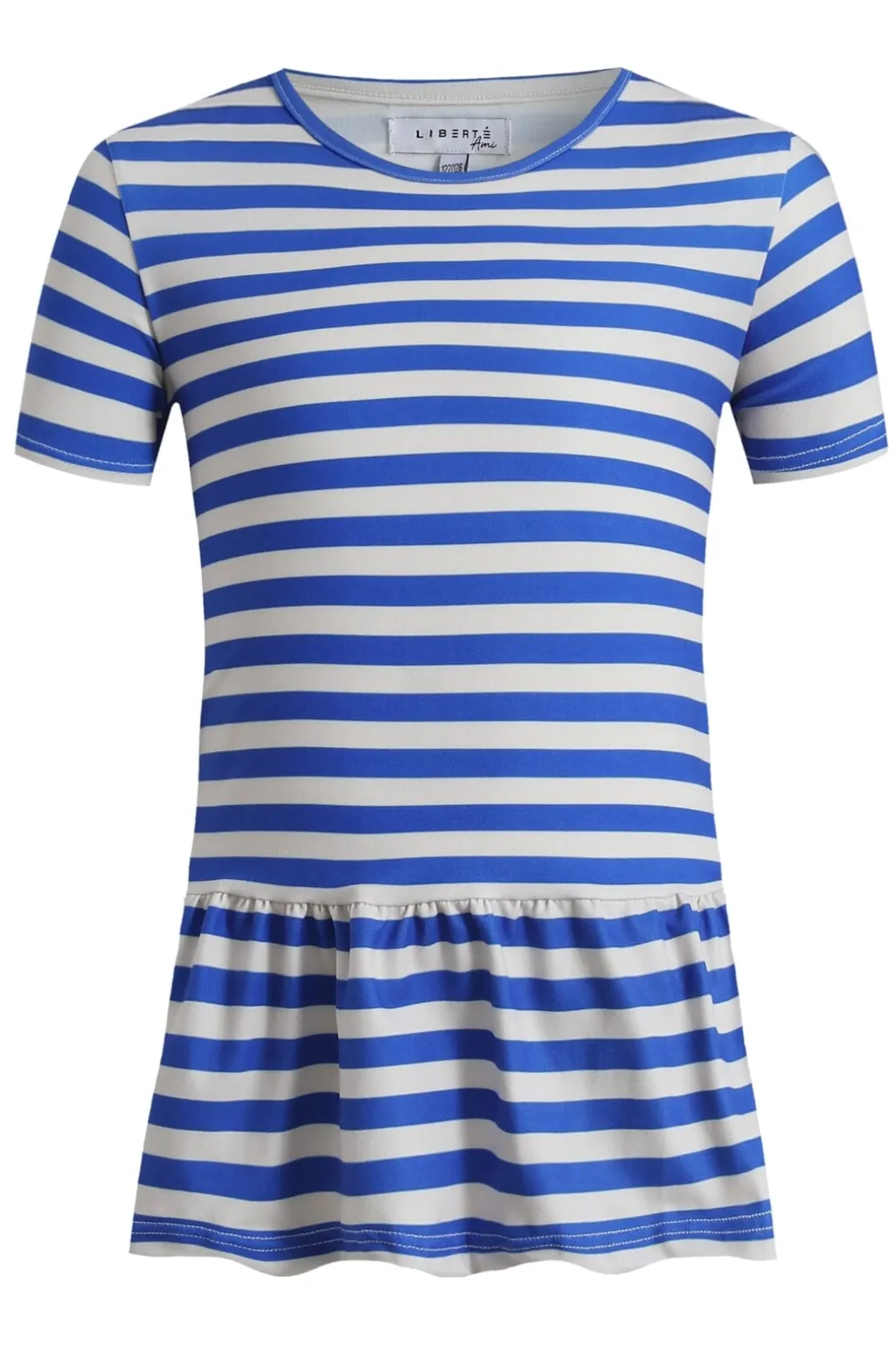 Stribet t-shirt fra Liberte Ami med blå og hvide striber. T-shirten har en rund halsudskæring, korte ærmer og en flæsekant nederst.