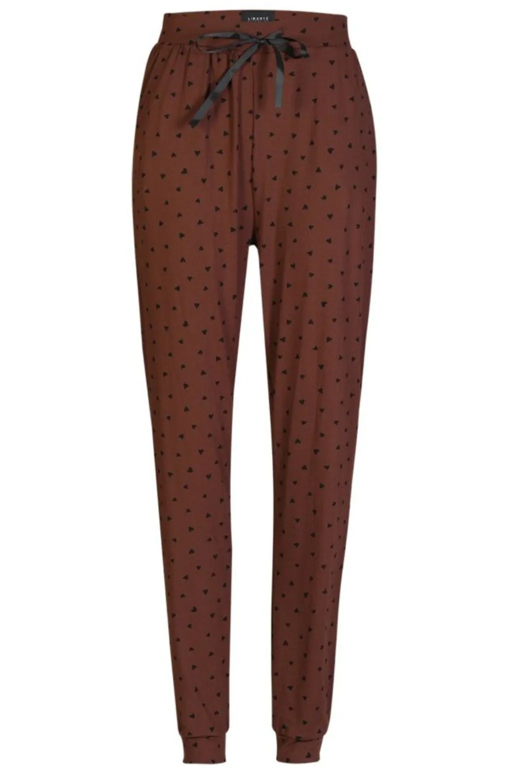 Brune bukser fra Liberte med sorte hjerteprint. Bukserne har en løs pasform og er lavet i blød Alma-kvalitet til afslapning derhjemme.