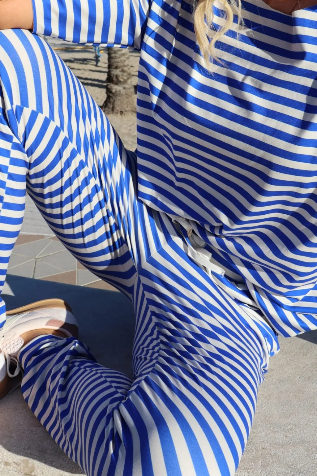 Stribede bukser fra Liberte med et afslappet design. Det ivory-hvide og koboltblå mønster går gennem hele bukserne, som har en løs pasform og ankelkort længde.