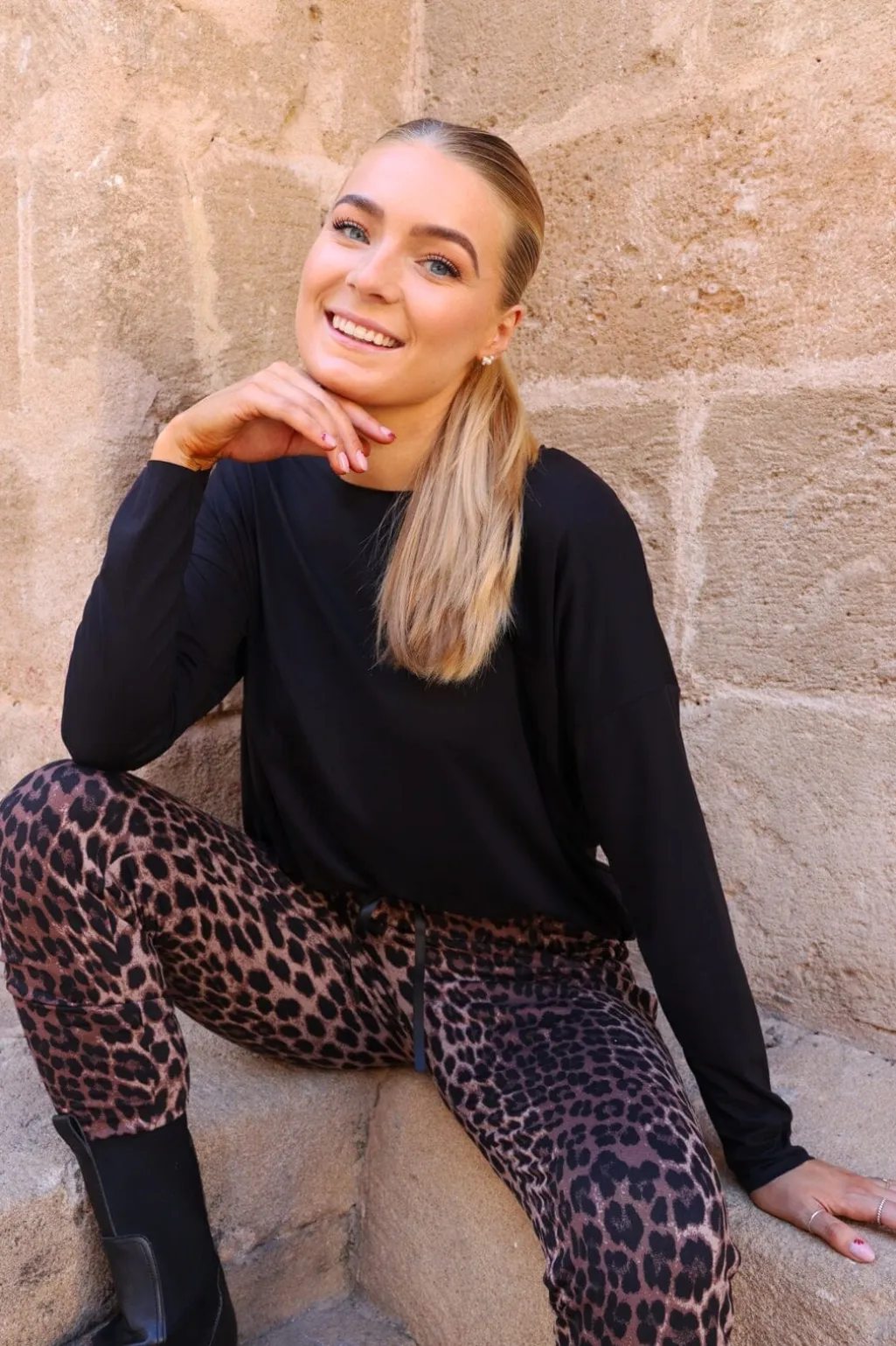 Fleecebukser fra Liberte med leopardmønster i brune og sorte nuancer. Bukserne er superbløde og har blød fleece på indersiden.