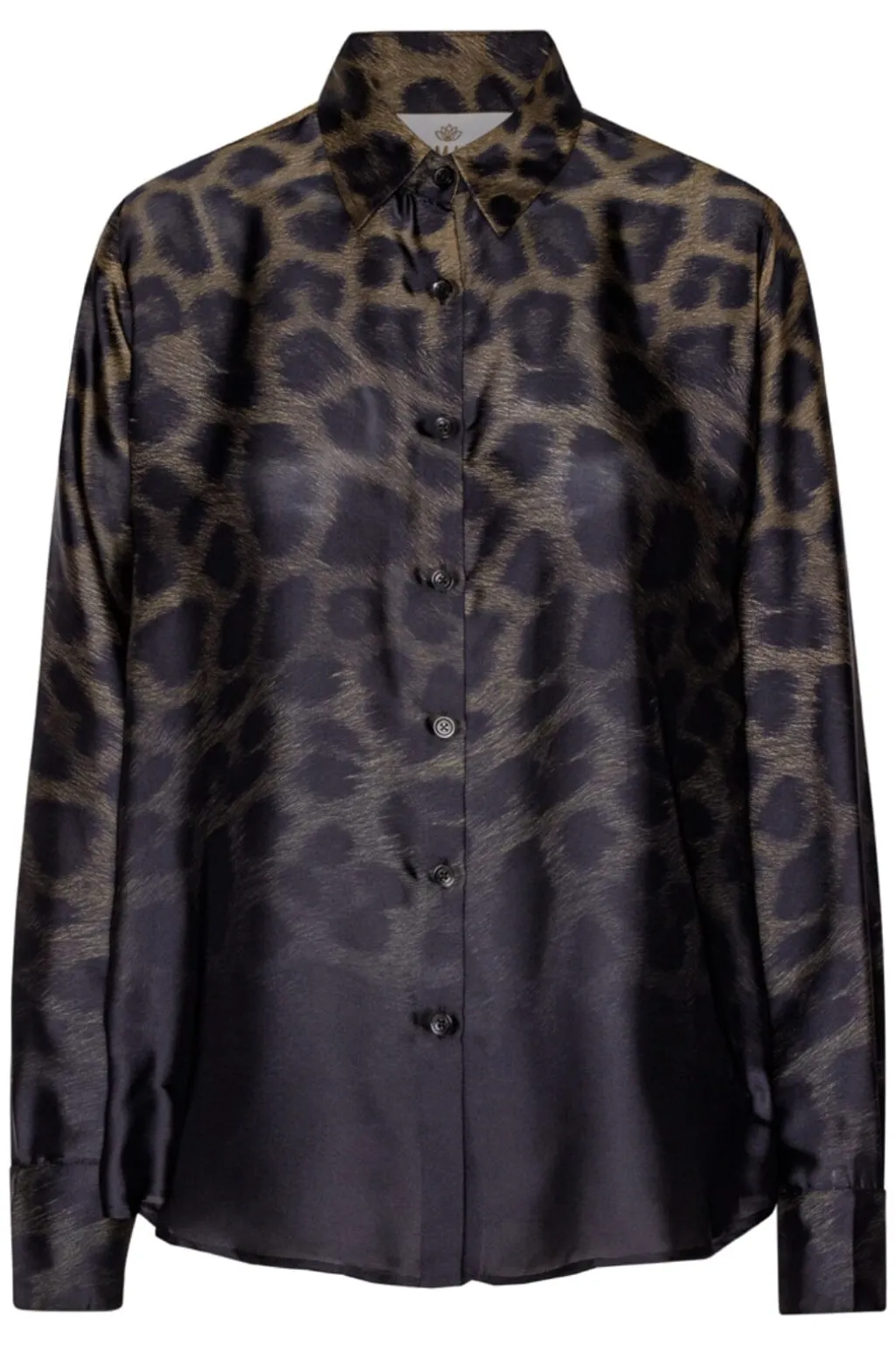 Skjorte fra Karmamia med gradient leopardmønster i brune og sorte nuancer. Skjorten har en klassisk skjortekrave og lange ærmer med knaplukning hele vejen ned.