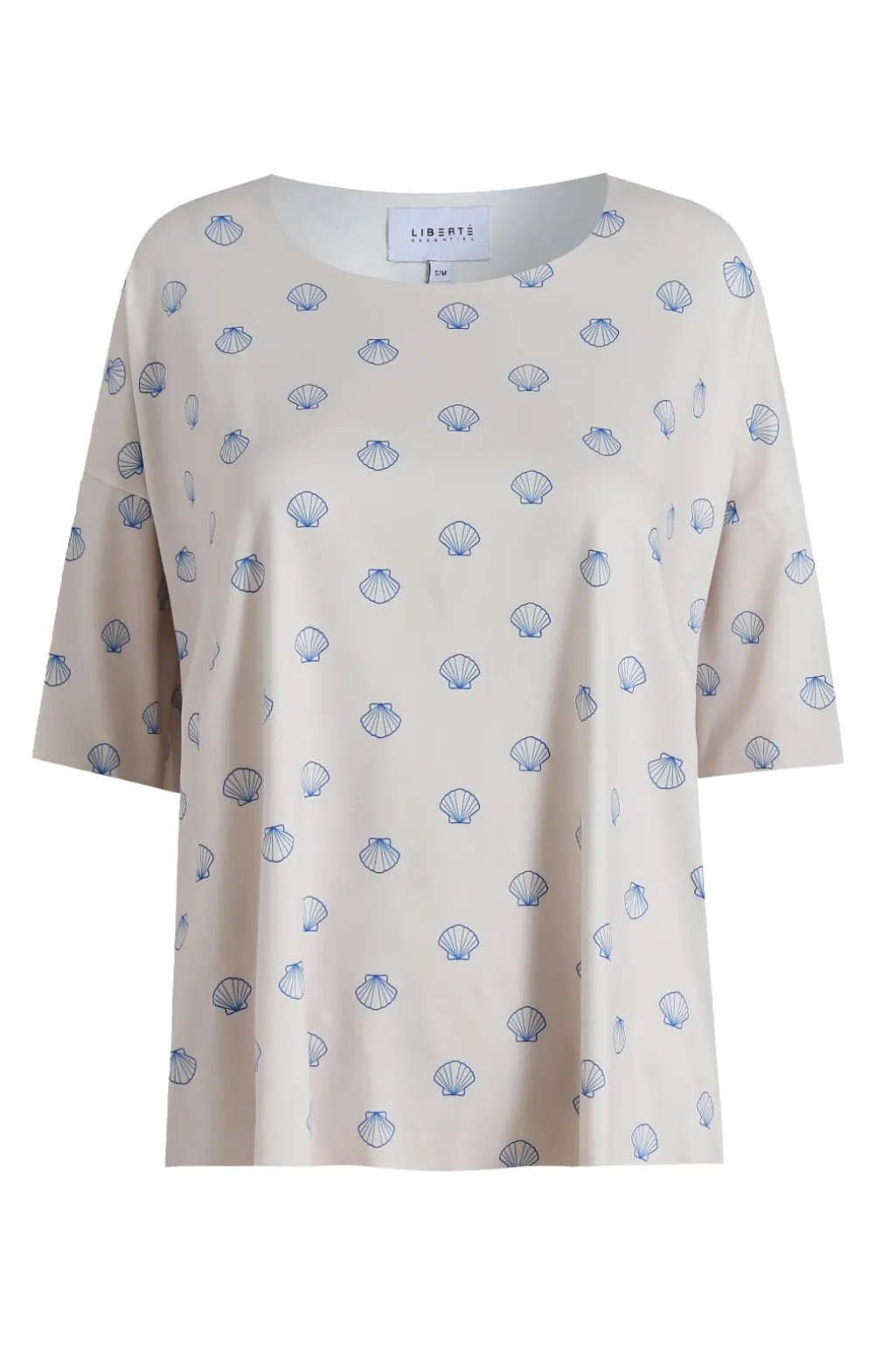 T-shirt fra Liberte med skalprint i blå nuancer på elfenbensfarvet baggrund. Den løse pasform og det maritime mønster giver t-shirten et sommerligt præg.