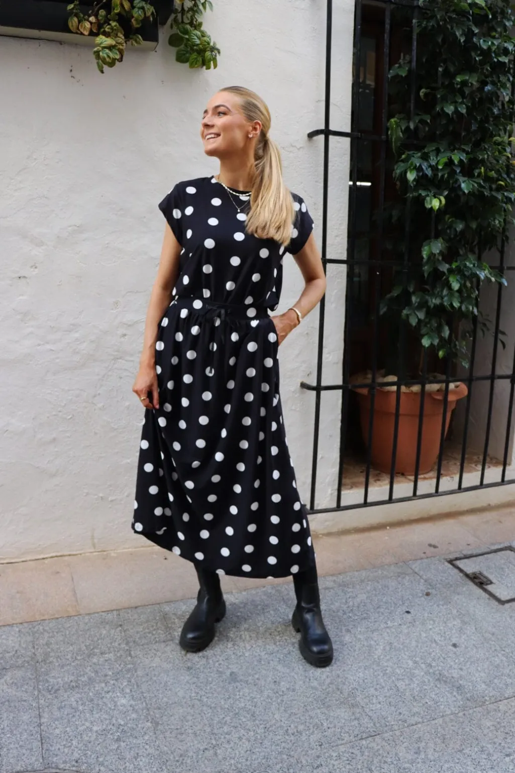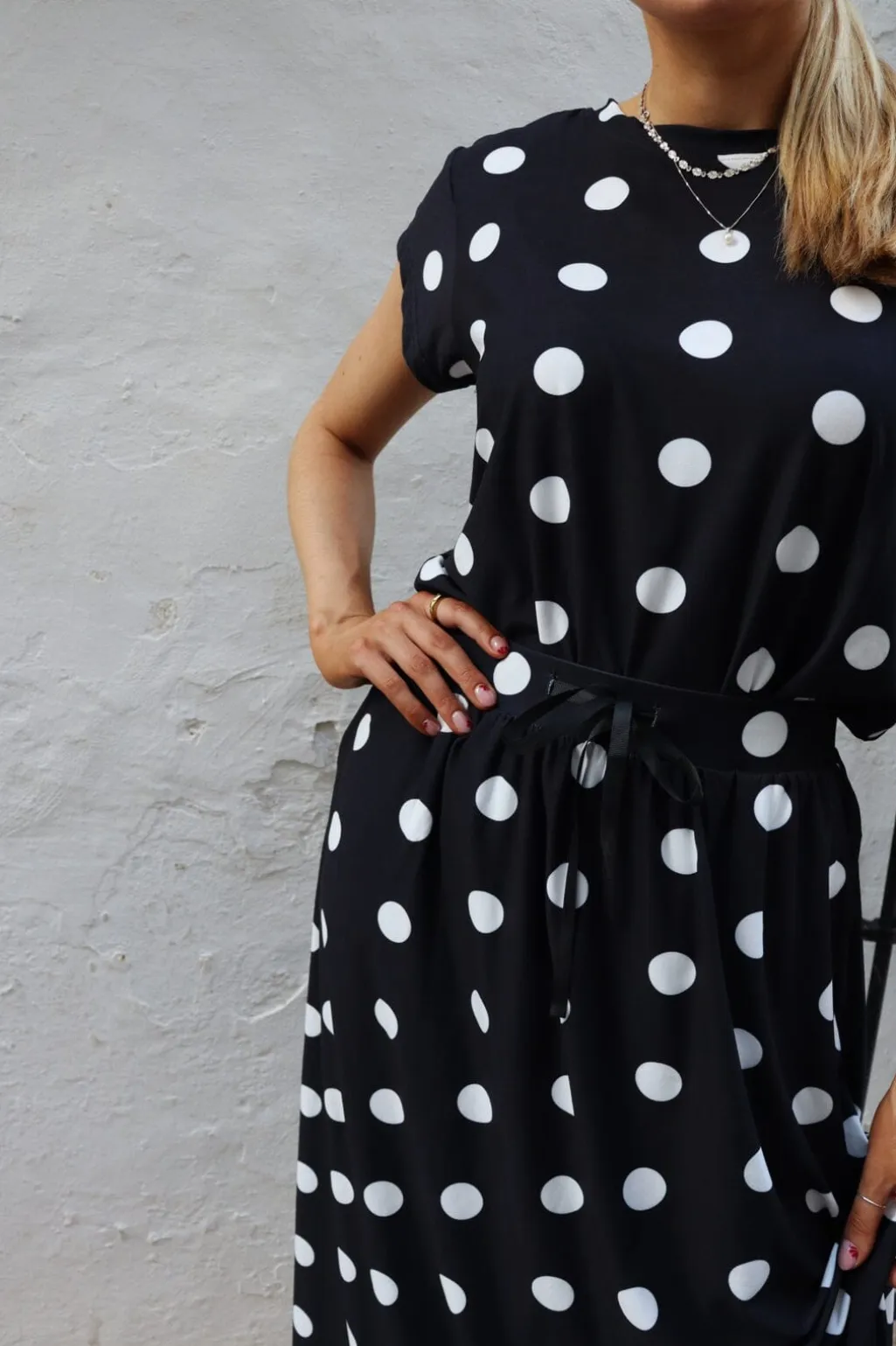 T-shirt fra Liberte i sort med store hvide prikker. Den har korte ærmer og en rund halsudskæring med bindebånd som detalje.