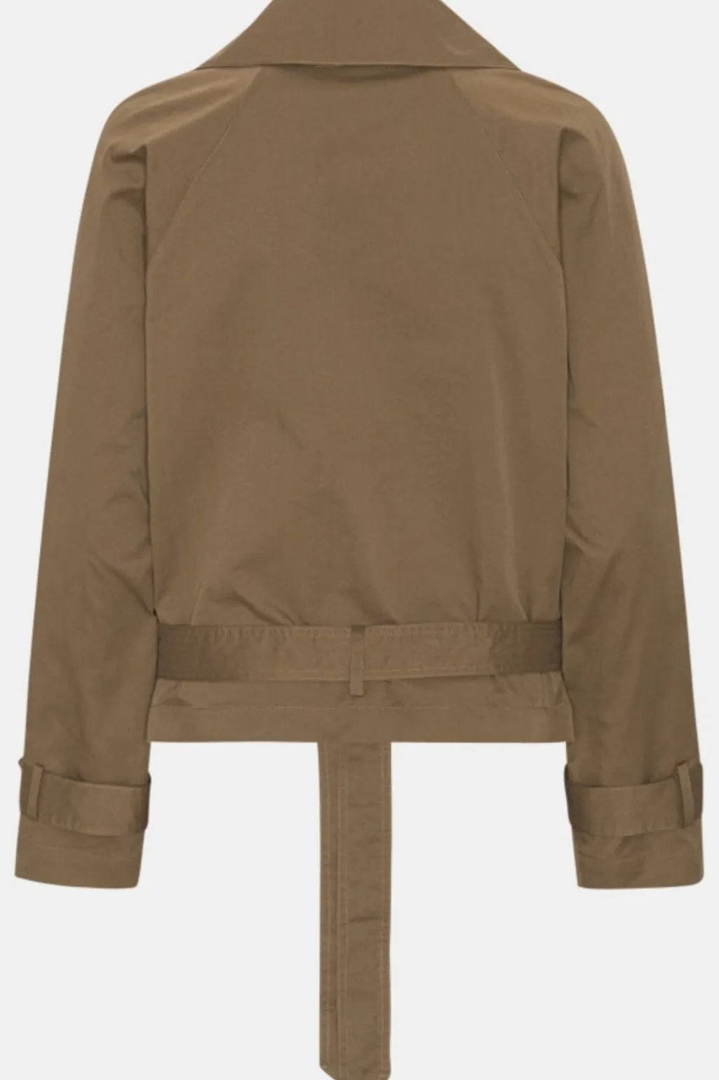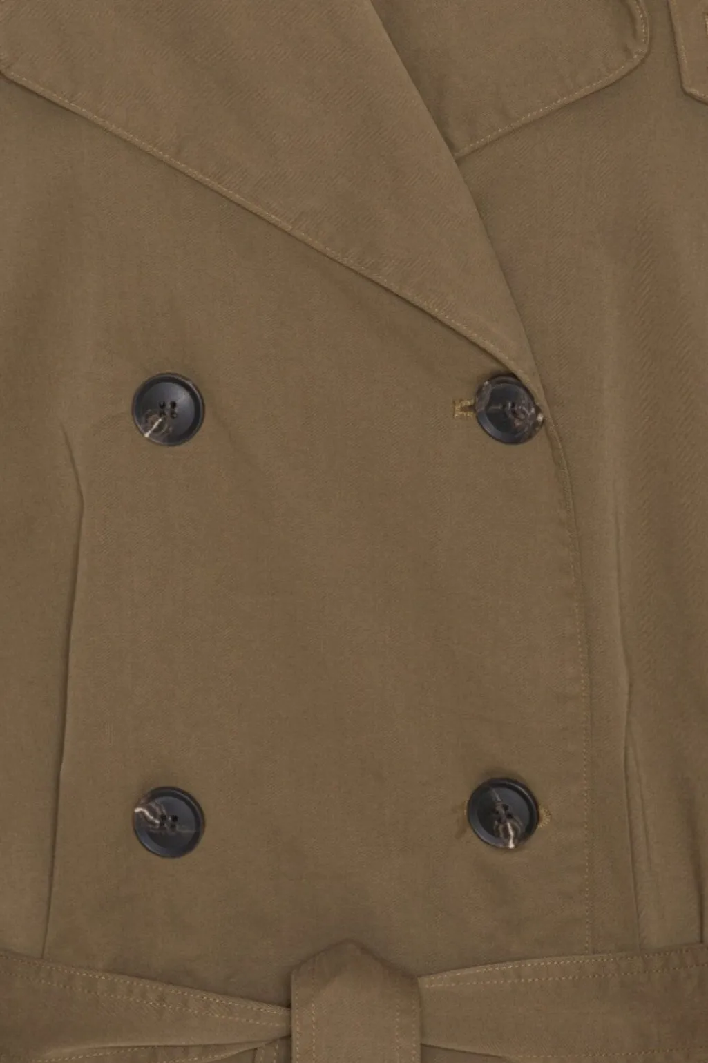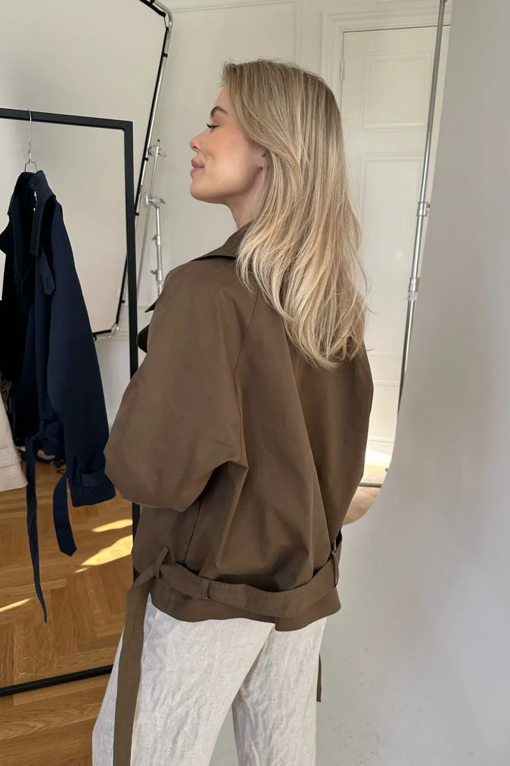 Brun trenchcoat fra BYIC med et dobbeltrækket design. Den oversized jakke har skjortekrave og lange ærmer samt et bælte i taljen, der kan bindes.