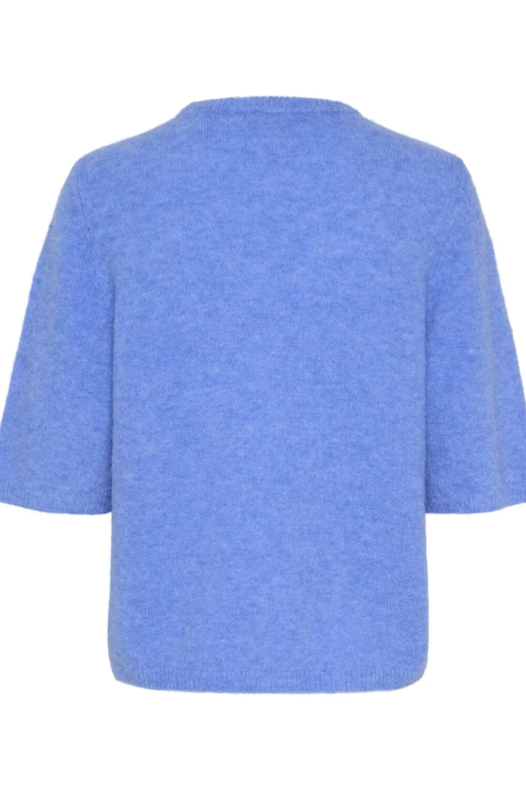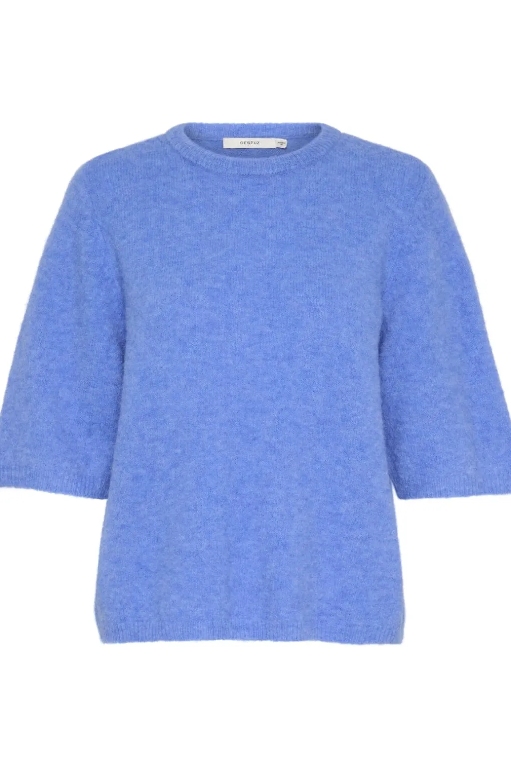 Blød strikbluse fra Gestuz i Wedgewood Melange. Den lyseblå farve har en meleret overflade, og blusen kommer med rund hals og 3/4-ærmer.