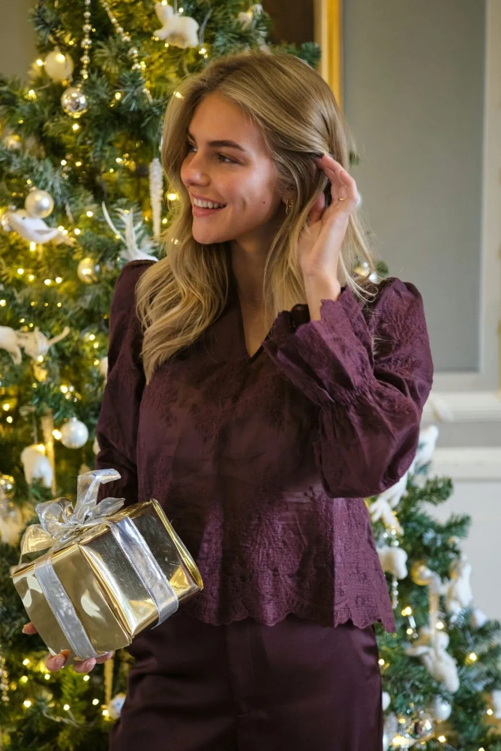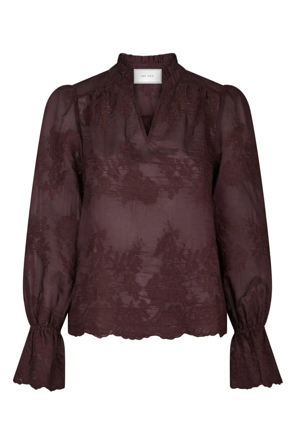 Broderet bluse fra Neo Noir i en dyb burgunderfarve. Blusen har et blomstermønster i broderi over hele stoffet, v-halsudskæring og lange ærmer med rynkede manchetter.