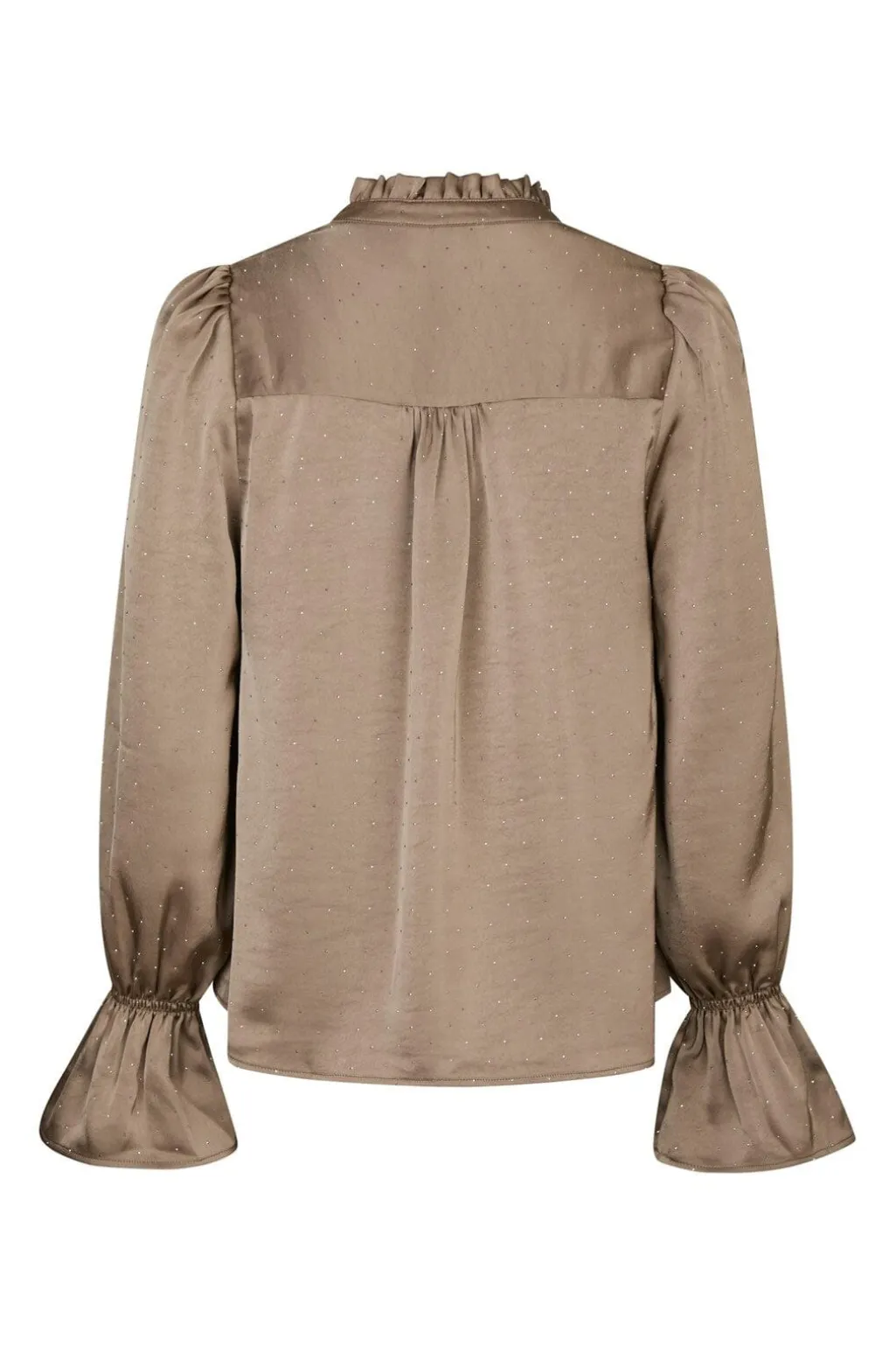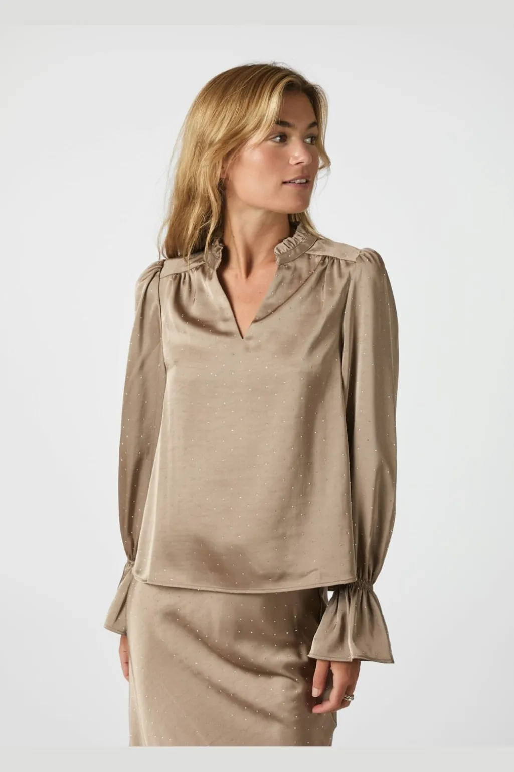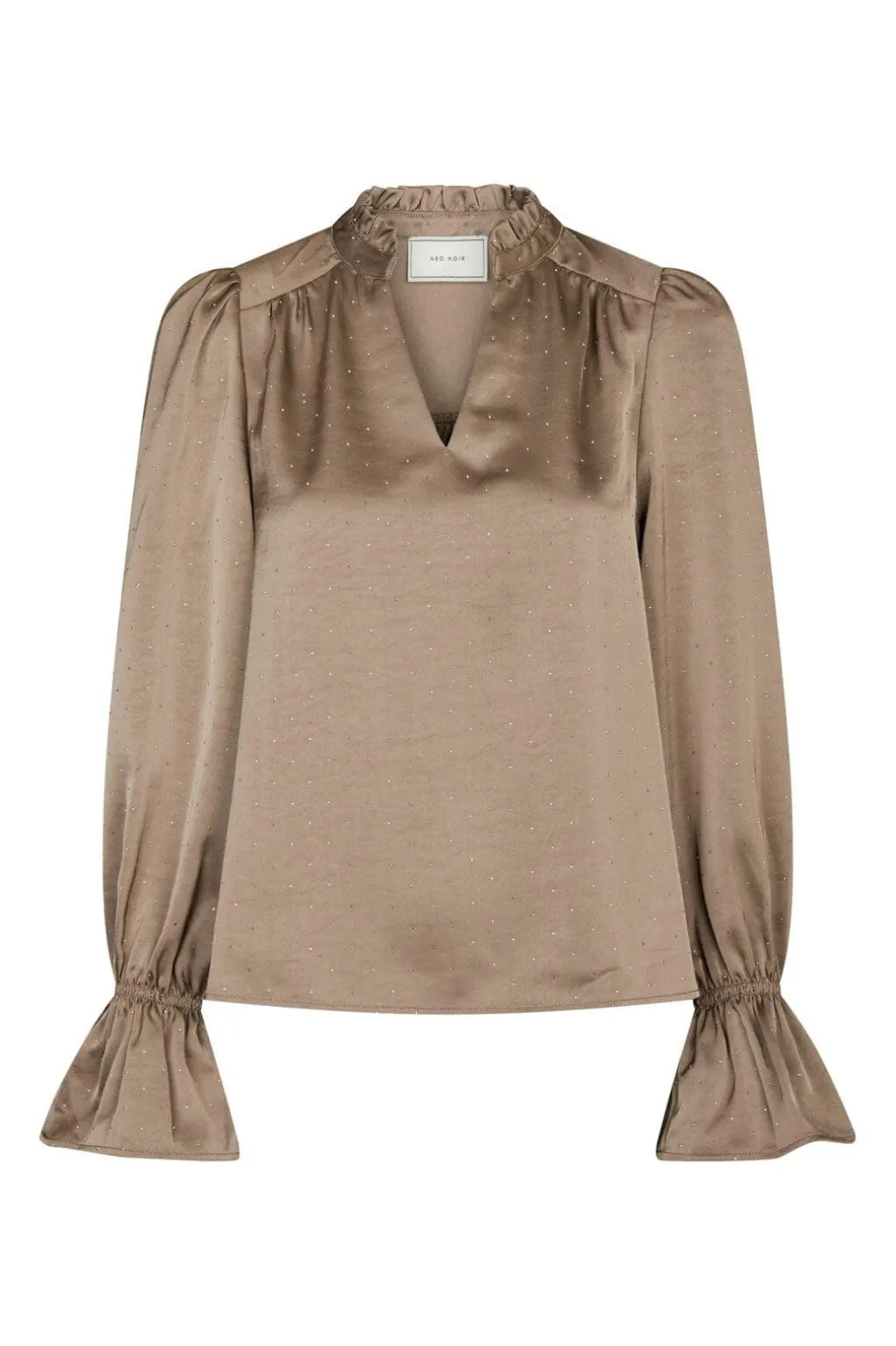 Brun satinbluse fra Neo Noir med prikket mønster og pailletter. Blusen har v-halsudskæring med rynkede detaljer og lange ærmer med flæser ved manchetterne.