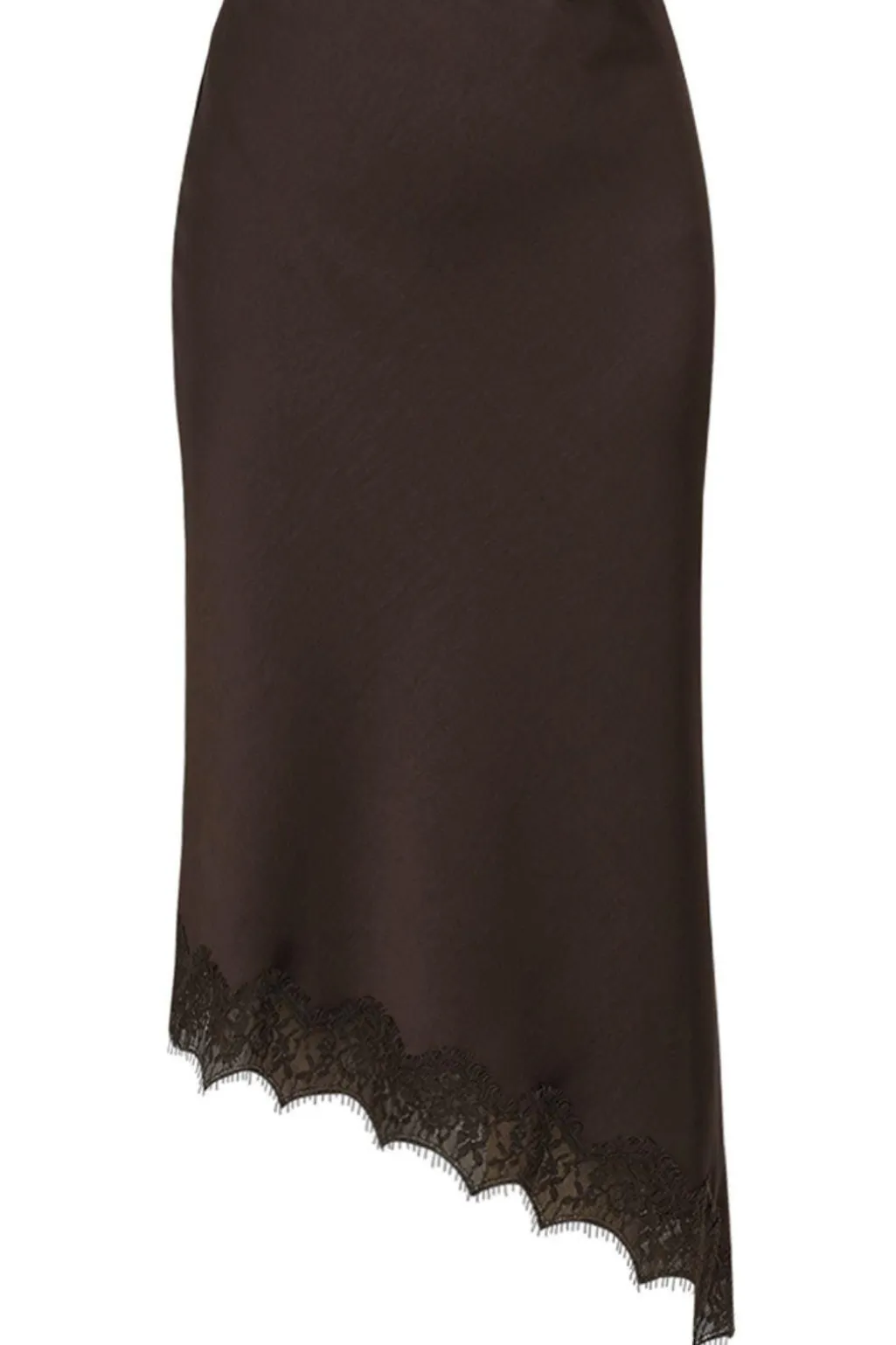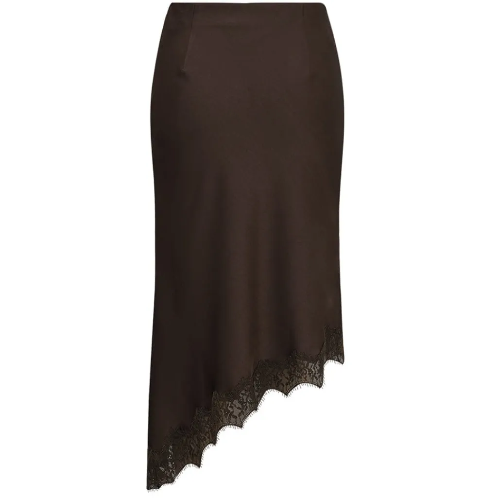 Brun nederdel fra Gossia i længde til læggen. Skørtet har en asymmetrisk kant med blondedetaljer og passer til både hverdag og fest i vinterens kolde måneder.