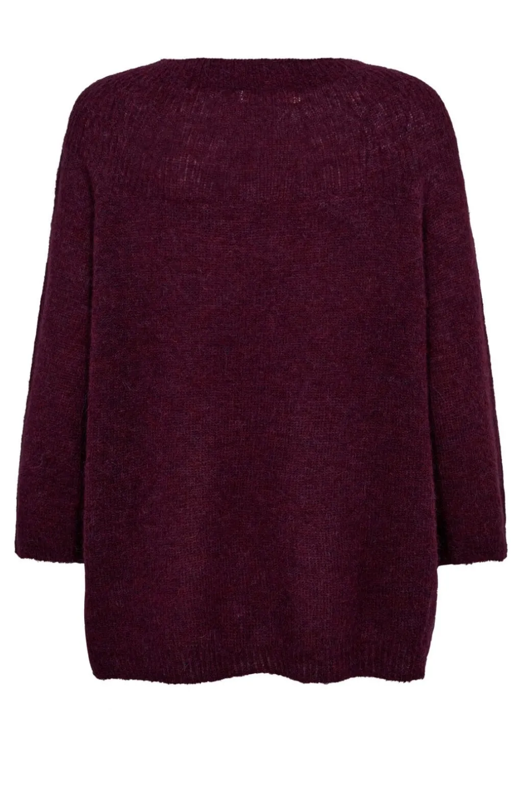 Mørk blommefarvet sweater fra Gossia med rund halsudskæring og 3/4 ærmer. Strikken har en ensfarvet overflade i en dyb blommefarve.