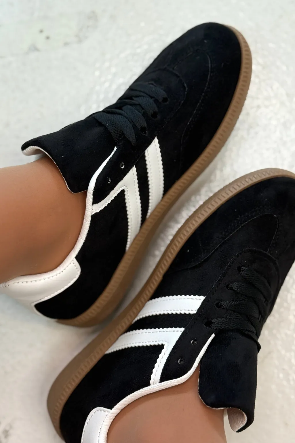 Sort sneaker fra Bloom med hvide striber på siden og brun sål. Skoen har sorte snørebånd og en rund tå.