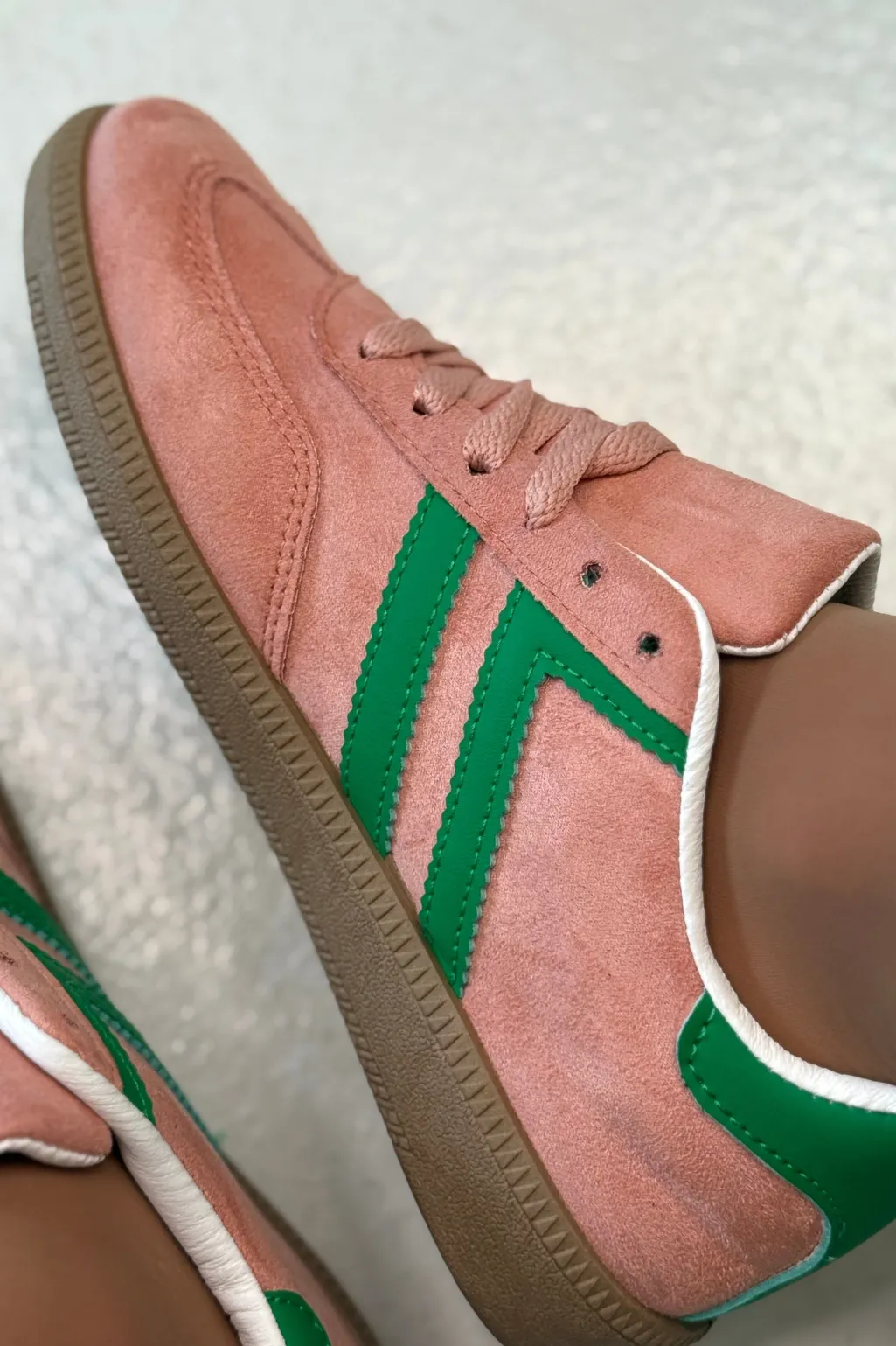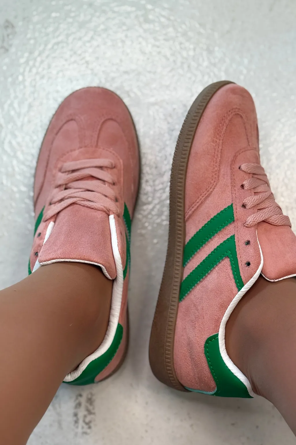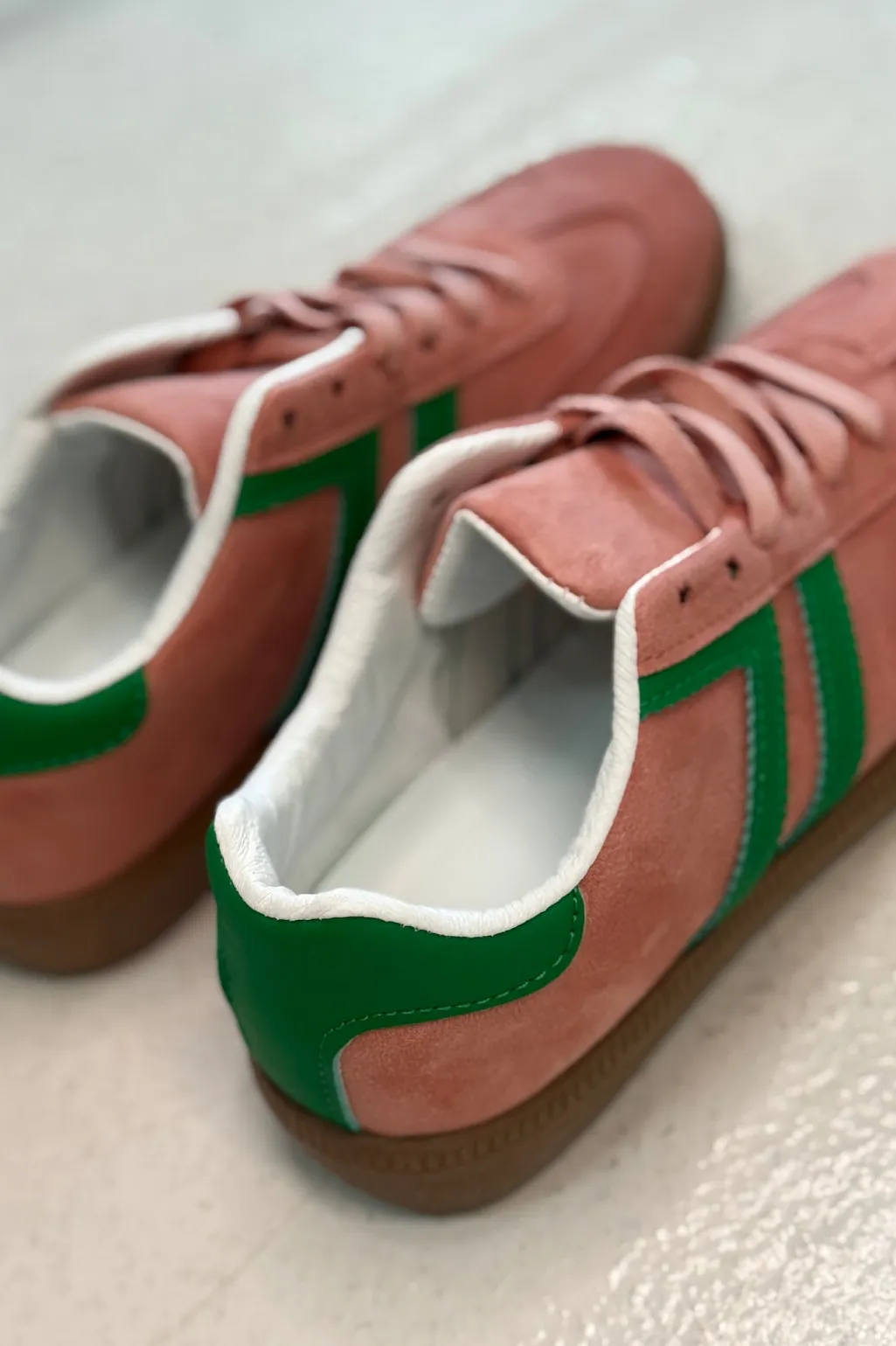 Lyserøde sneakers fra Bloom, lavet af syntetisk materiale. Skoene har grønne detaljer på siden og en brun sål, der giver dem et farverigt udtryk.