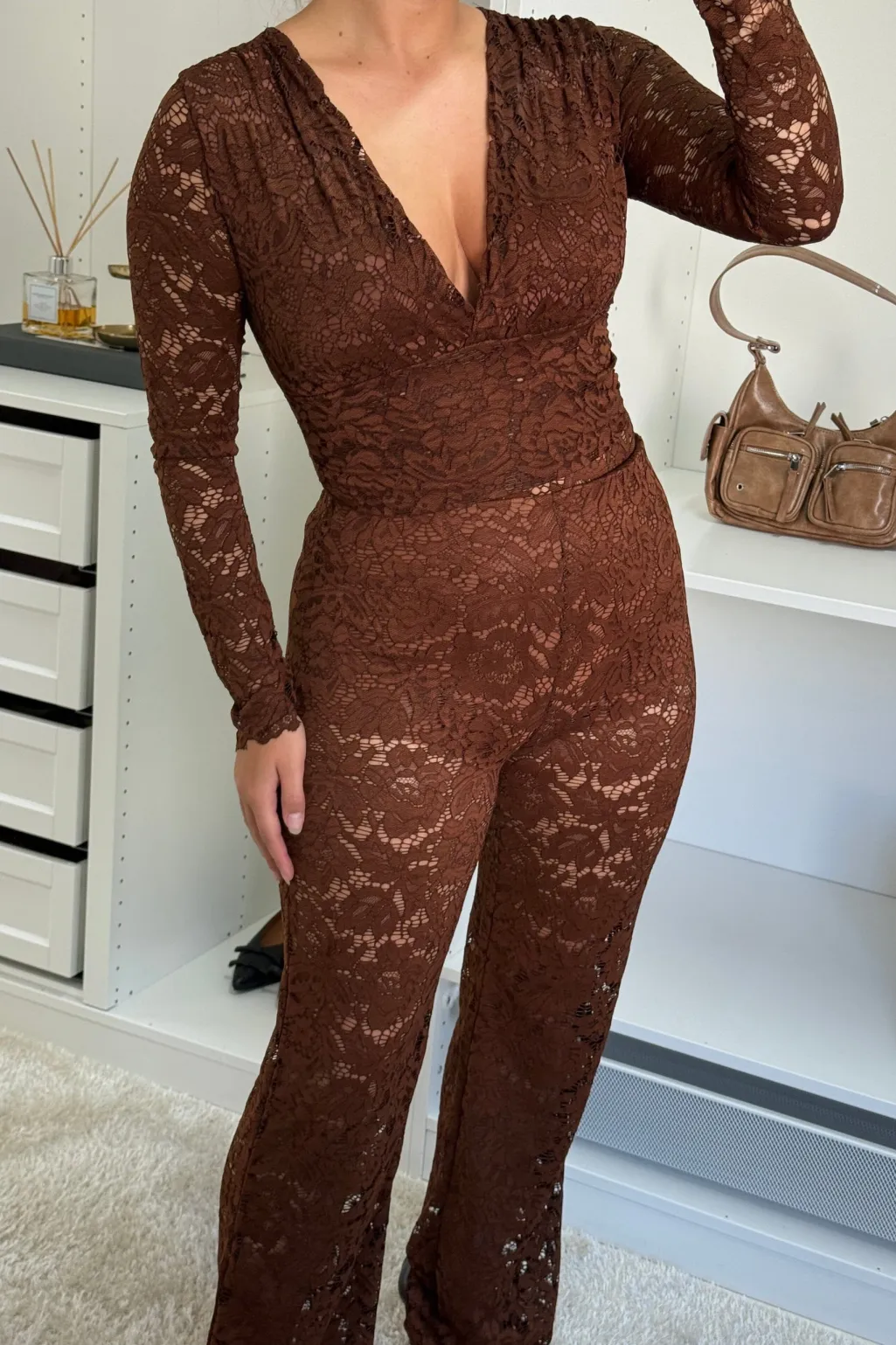 En bodystocking fra A-bee i mørkebrun. Bodystockingen har blonder med et blomstermønster, en V-hals og lange ærmer.