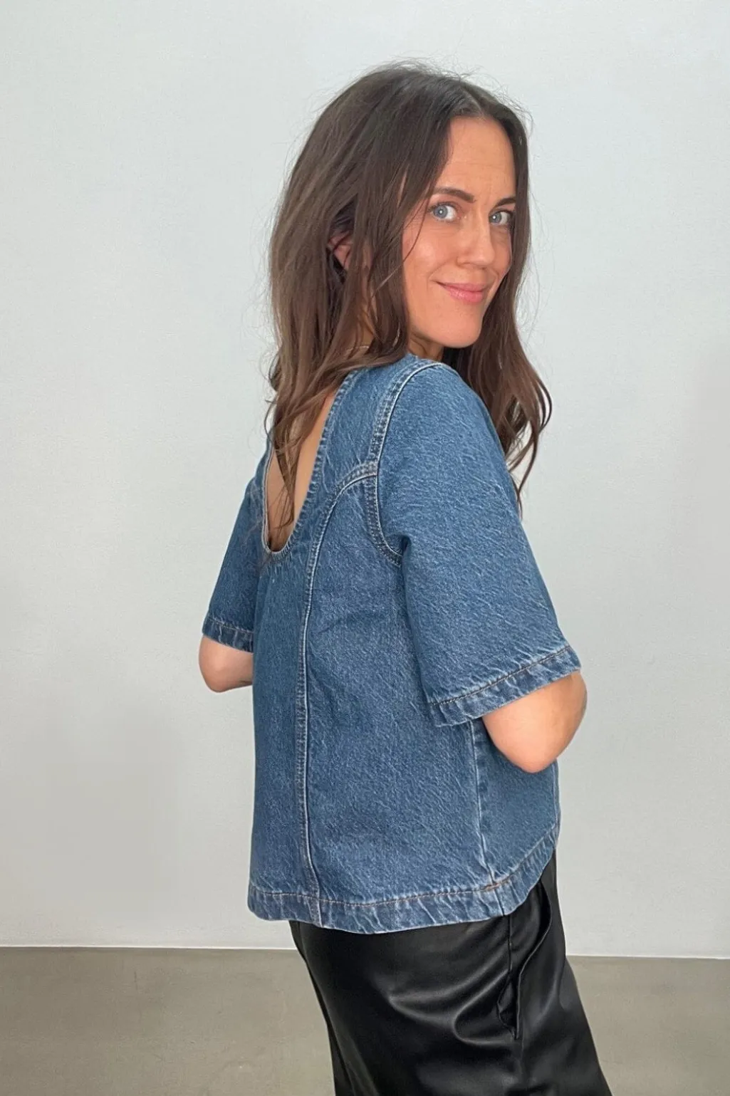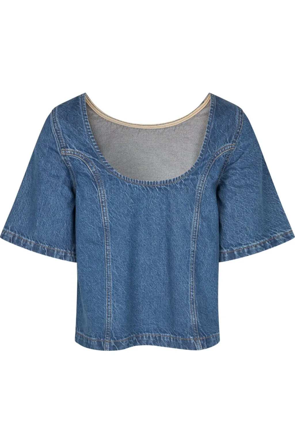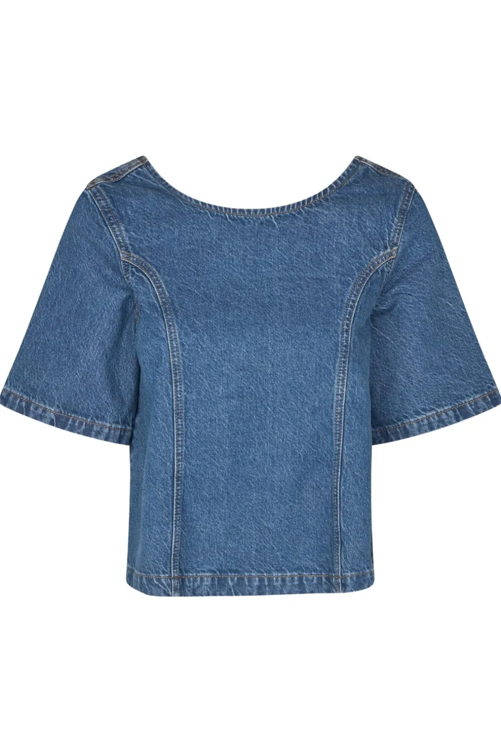 Denimtop fra Global Funk i en vintage blå vask. Toppen har en åben ryg med dekorative syninger og korte ærmer. Den runde halsudskæring giver et afslappet udtryk.