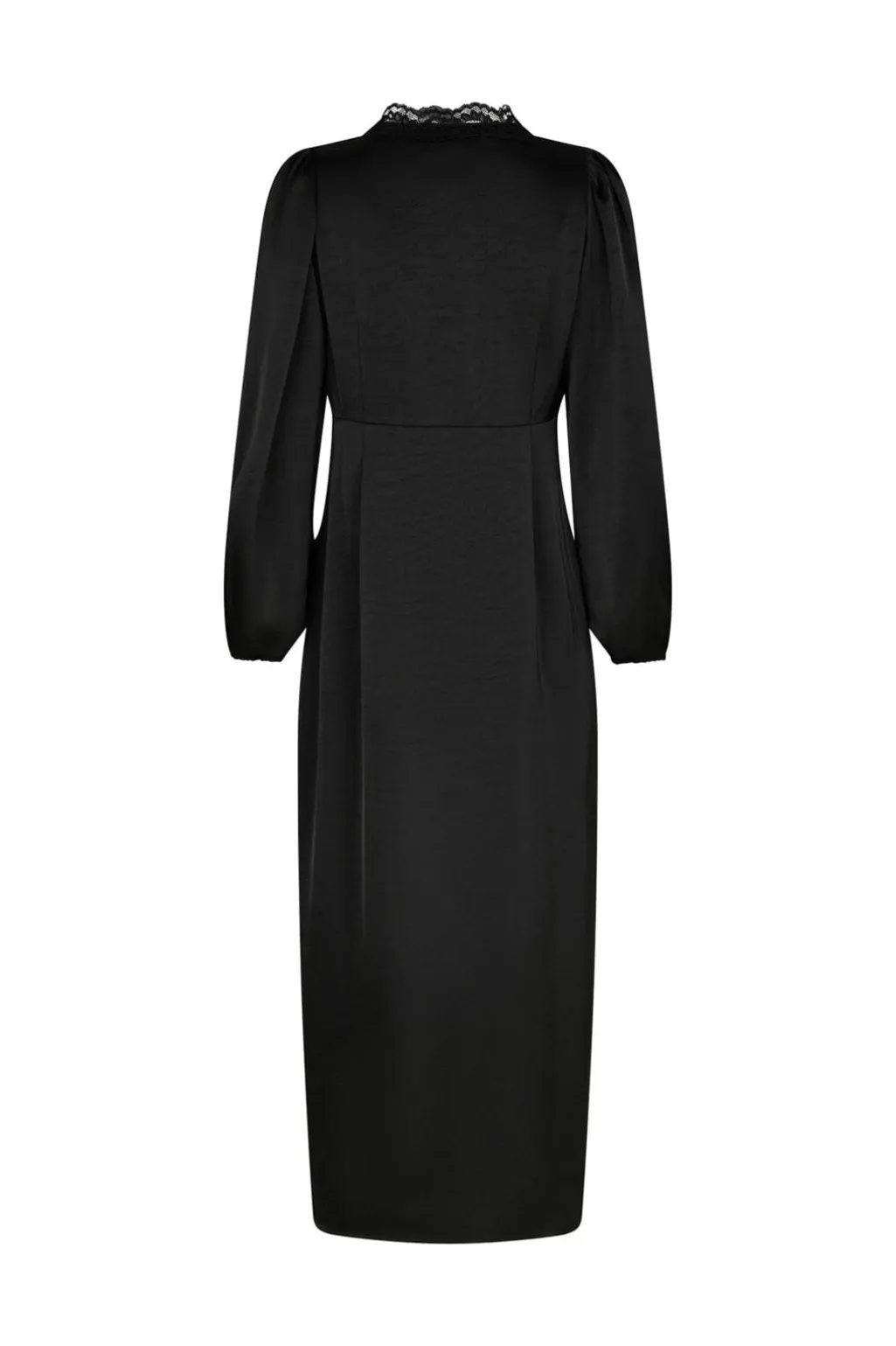 Sort satinkjole fra Neo Noir med knapper langs fronten. Kjolen har V-hals med blondekant og 3/4-lange ærmer med let puf. Den lange model er lavet i tung satin.