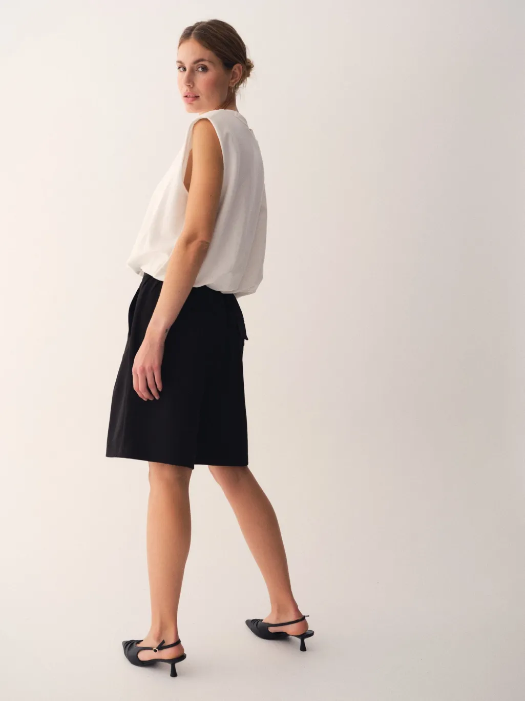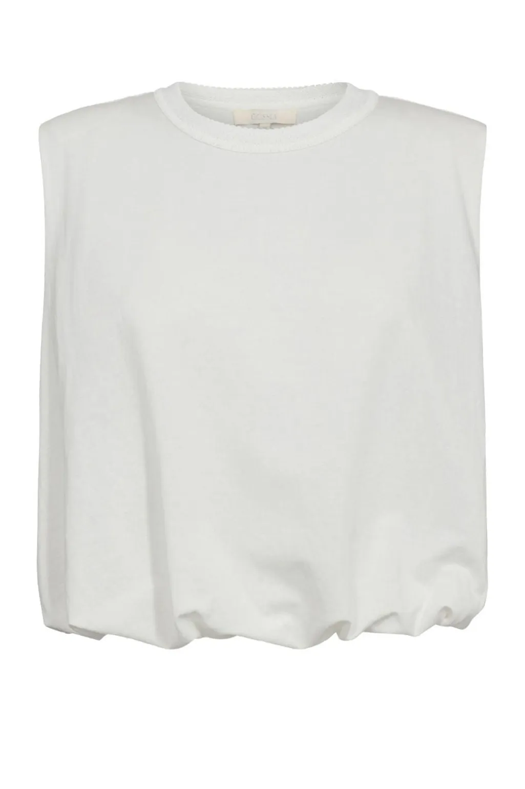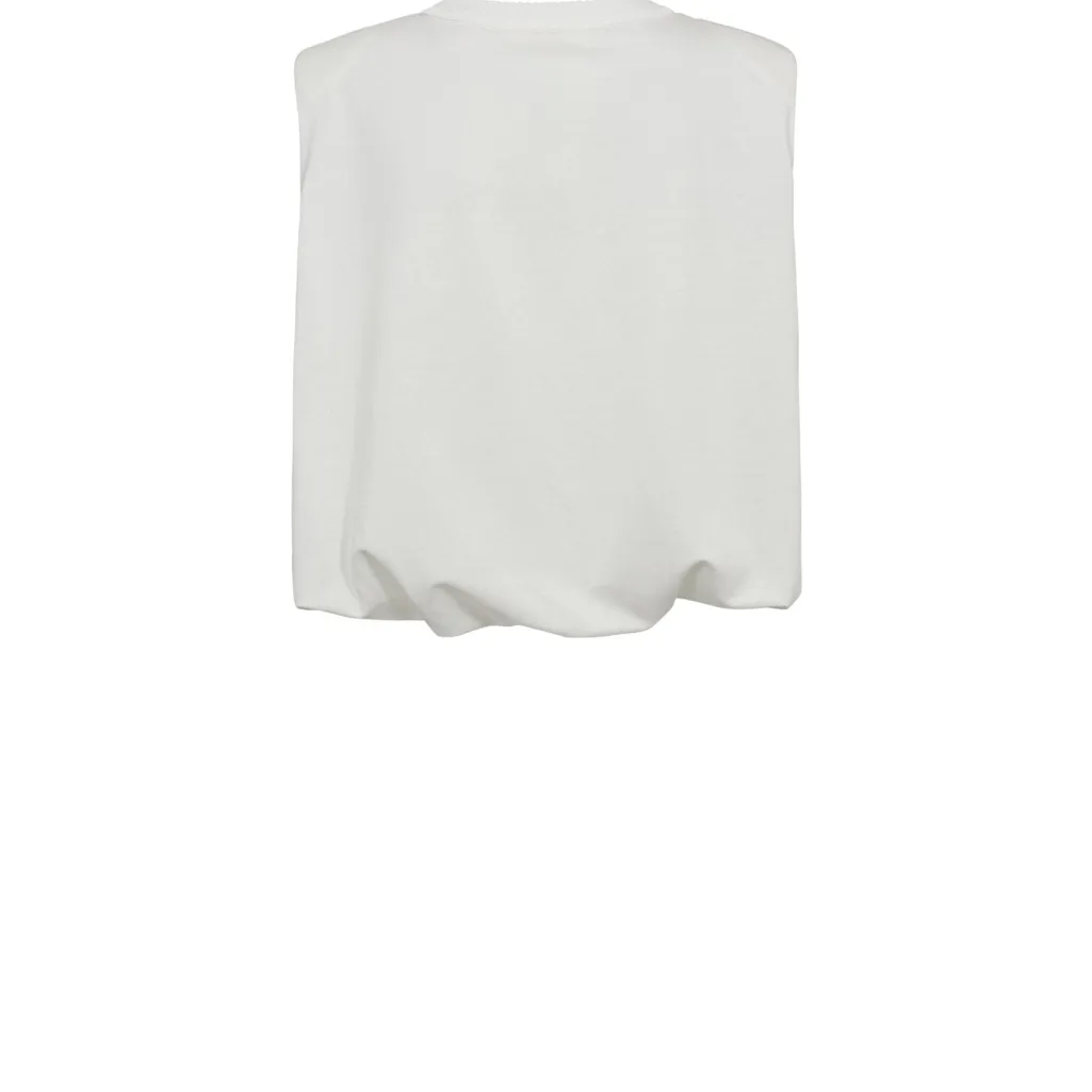 Ærmeløs top fra Gossia i off-white med dekorative syninger og flæser. Toppen har en løs pasform med rund halsudskæring og elastisk kant forneden.