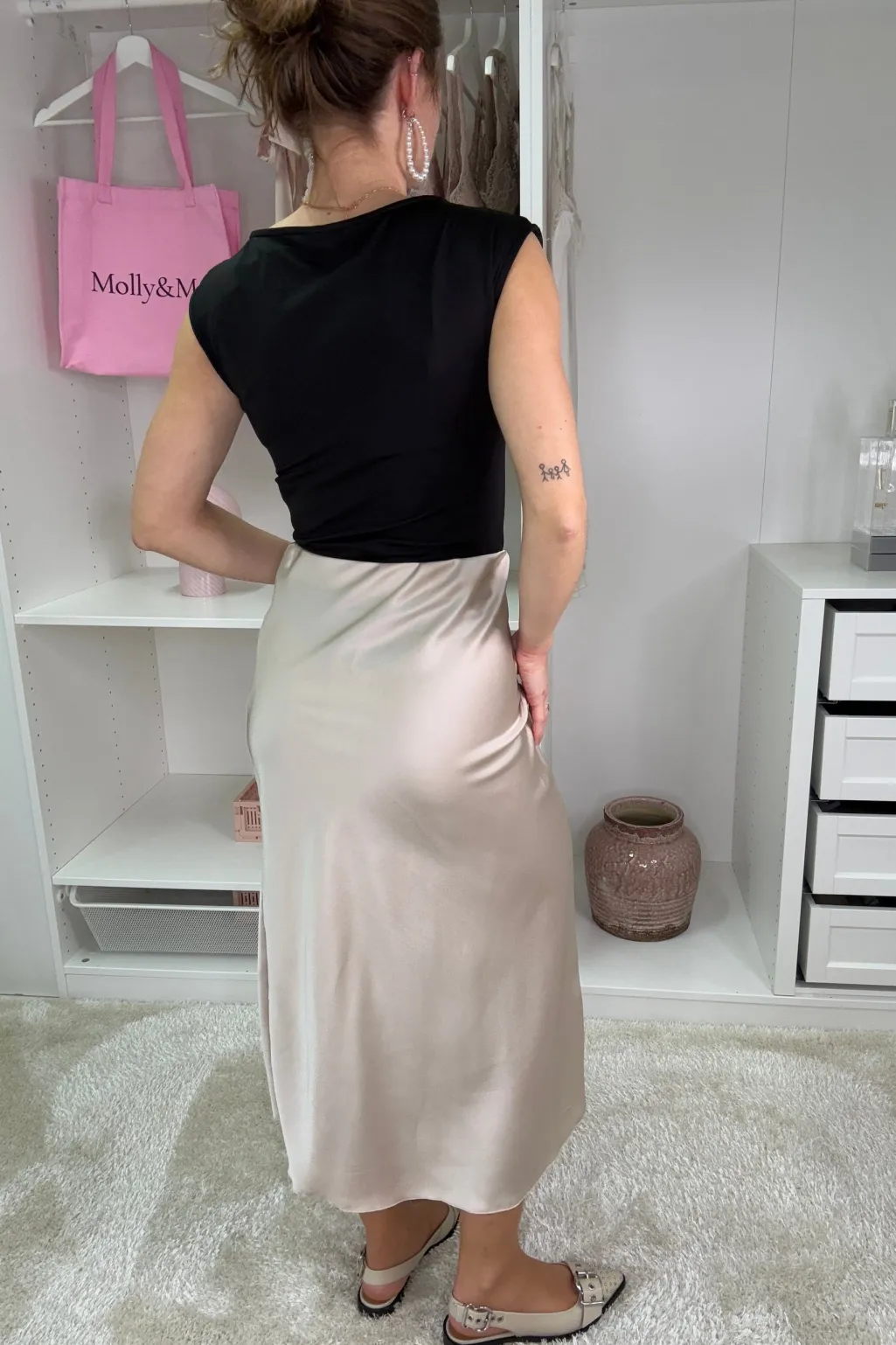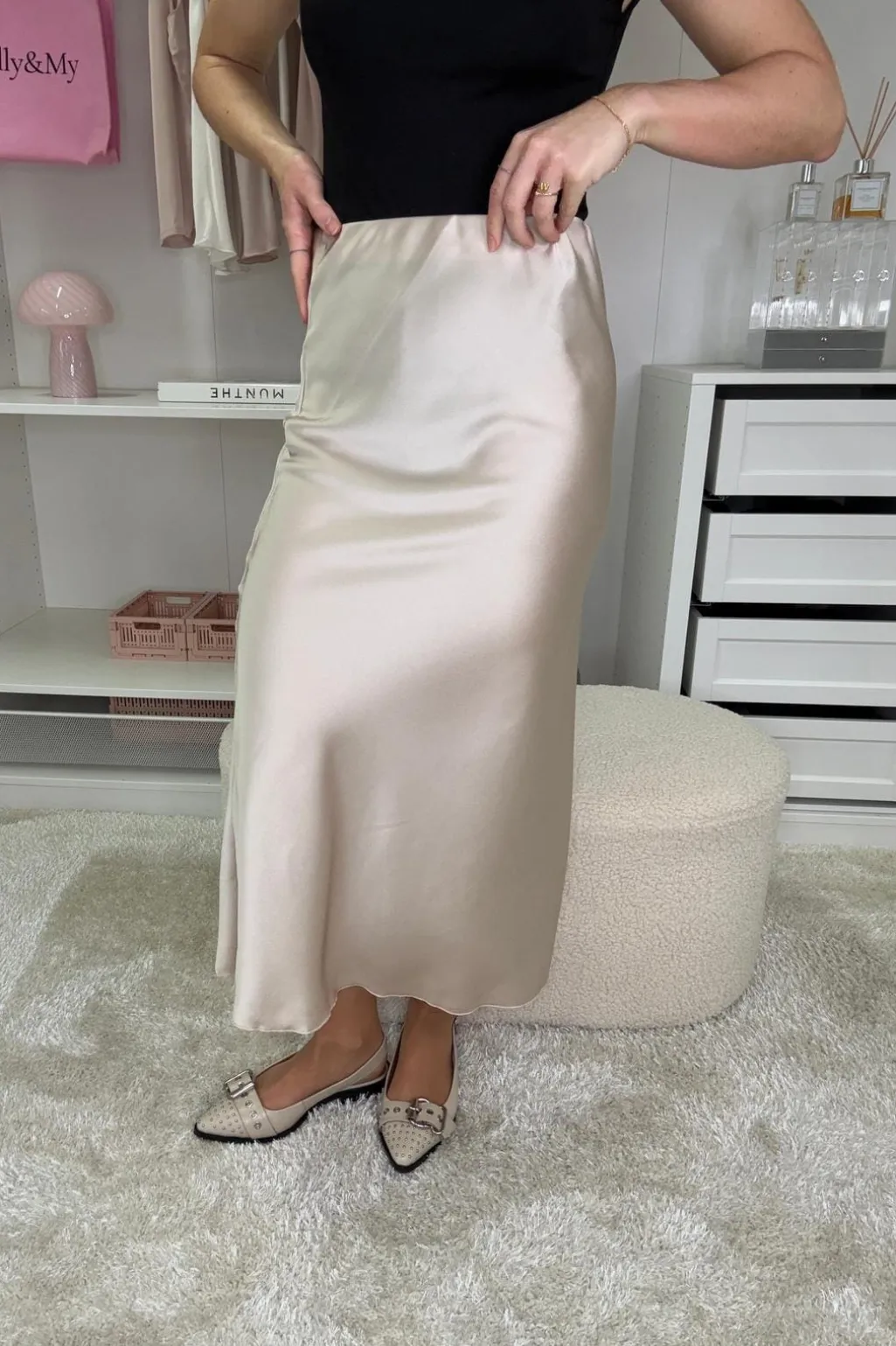 Nederdel fra A-bee i champagnefarvet satin. Den glatte overflade giver et blankt udtryk, og skørtet falder blødt til midt på læggen.