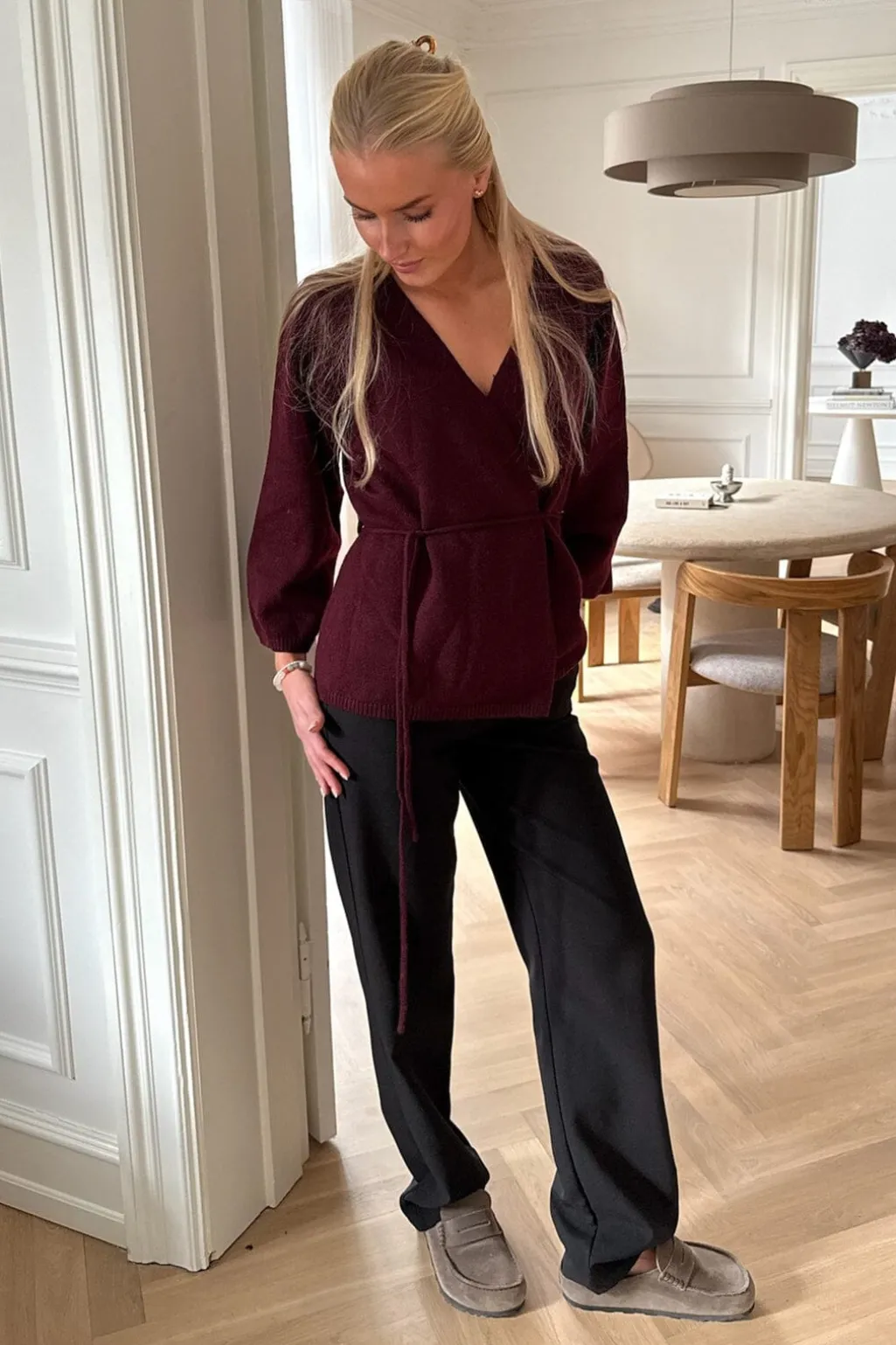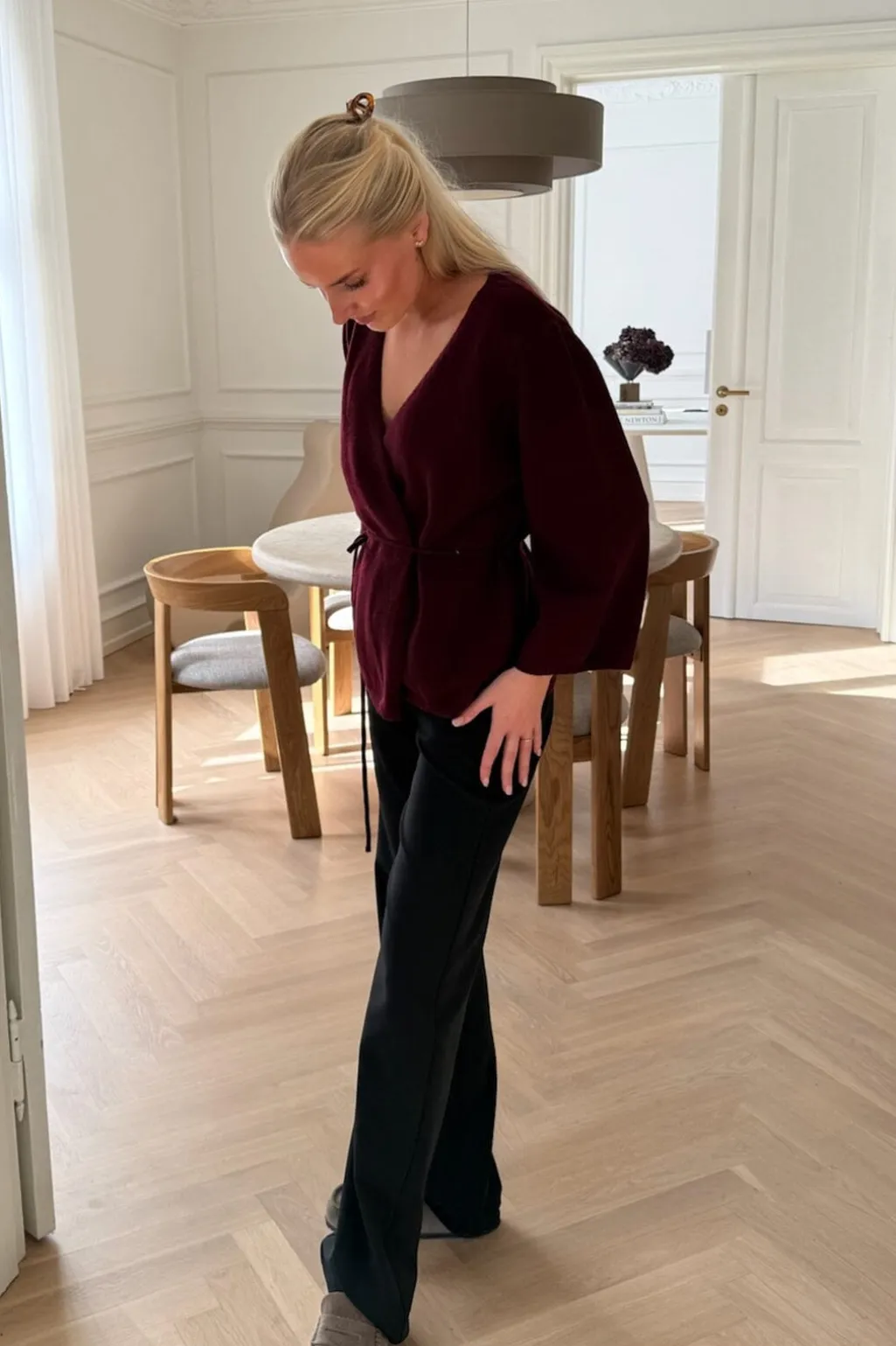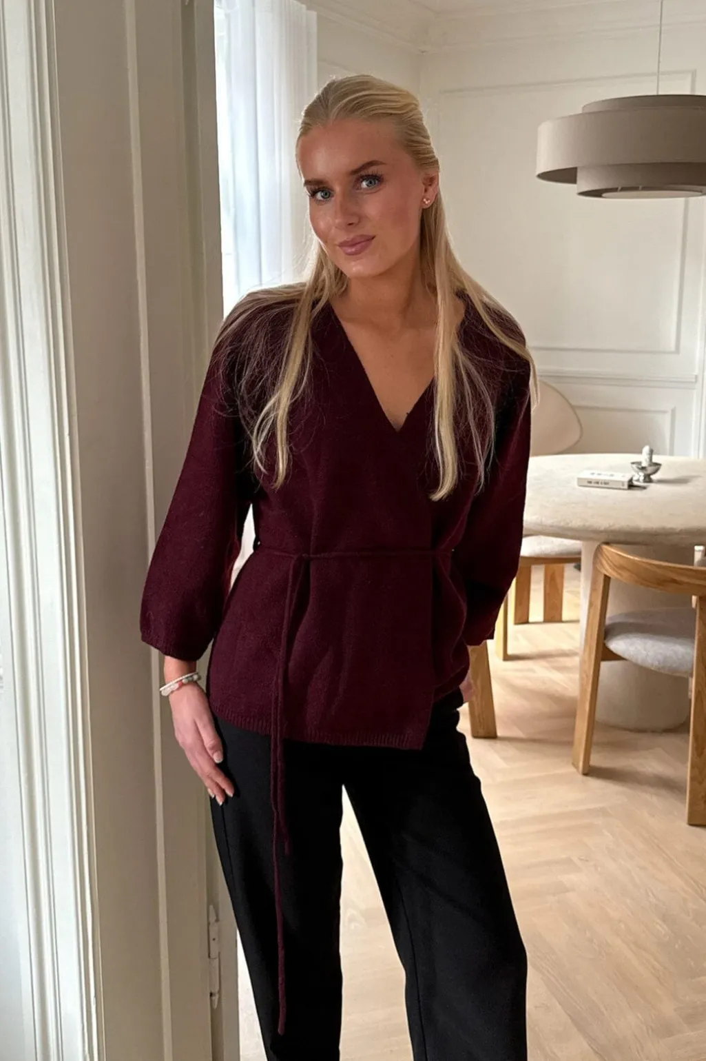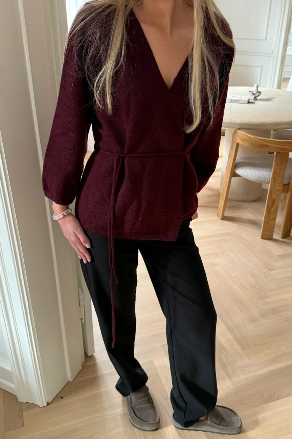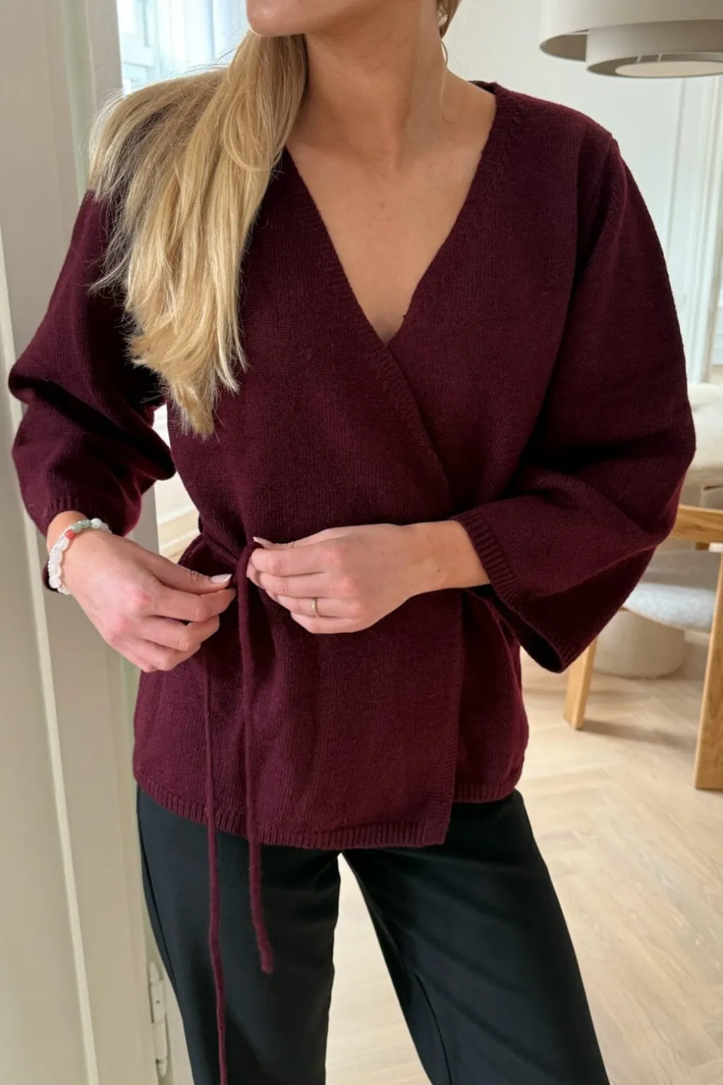 Bordeaux cardigan fra BYIC med V-udskæring og bindebånd i taljen. Den har en wrap-funktion og brede 3/4-ærmer med slank ribkant langs kanterne.