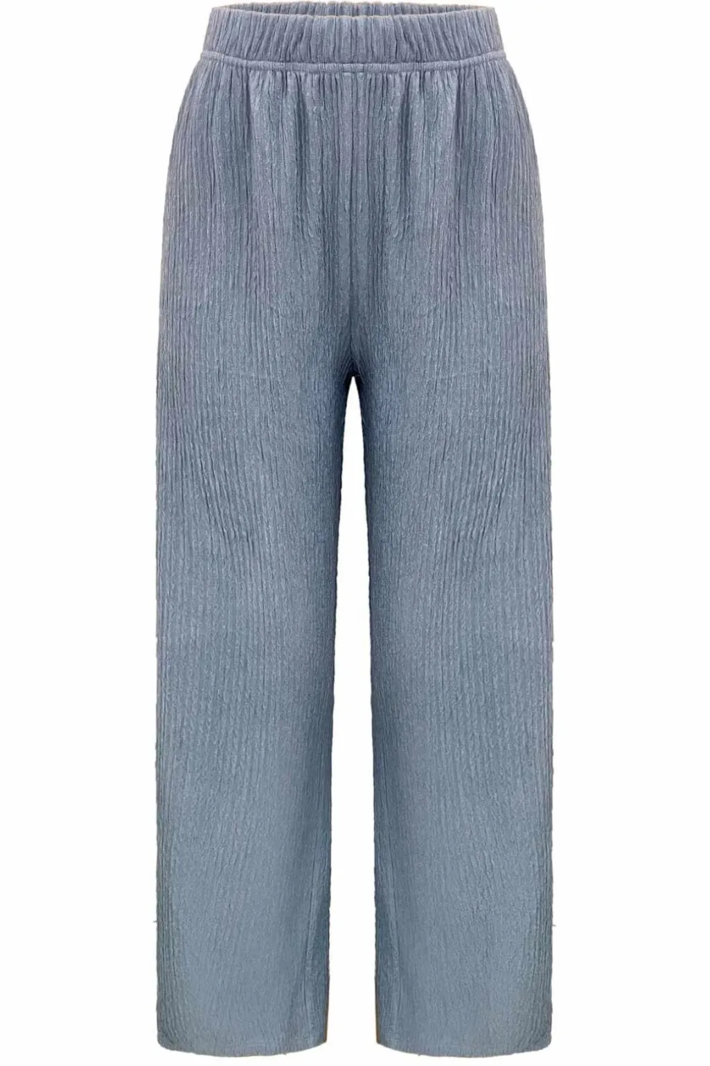 Bukser fra Liberte i en lys blå nuance. De har brede ben og en afslappet pasform med elastisk talje. Stoffet har en struktureret overflade, der giver bukserne et let udtryk.