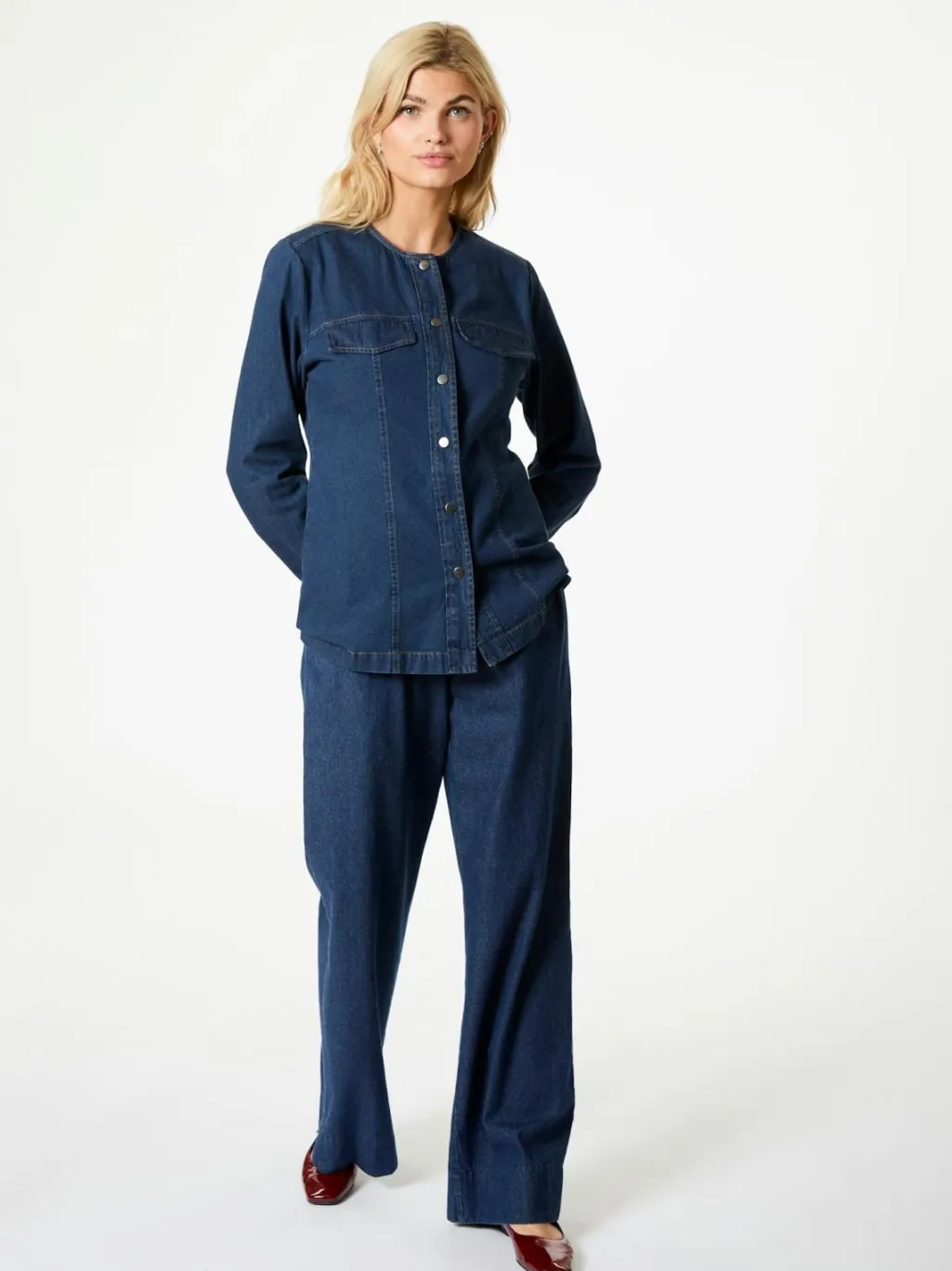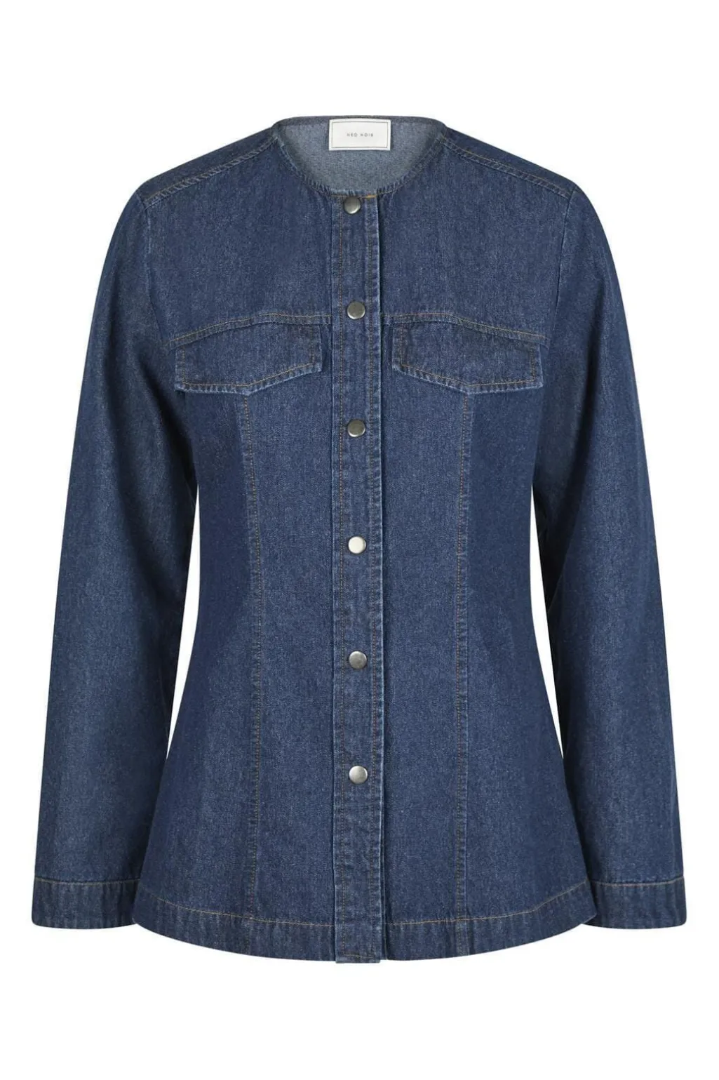 Mørkeblå denimbluse fra Neo Noir med rund halsudskæring. Blusen har synlige knapper foran og to praktiske lommer på brystet.