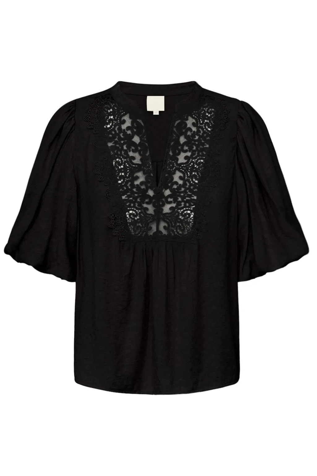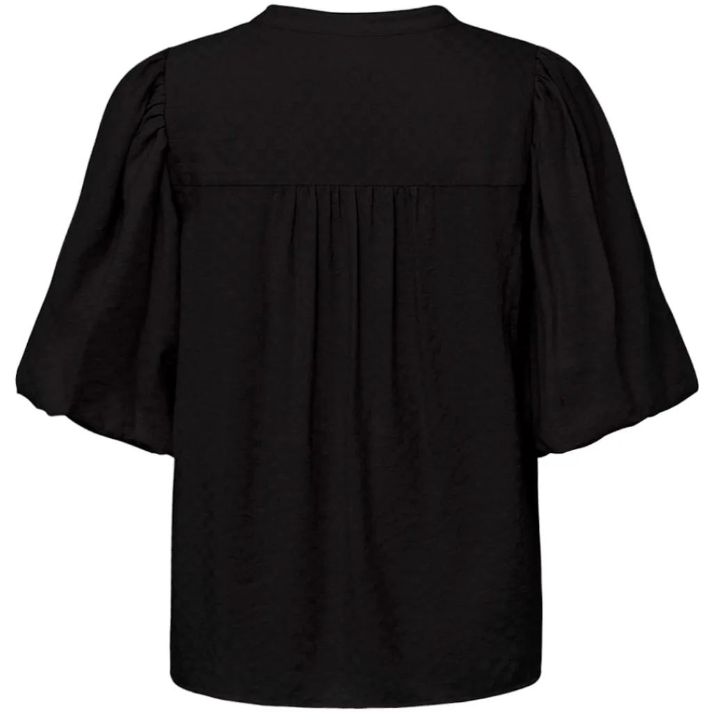 Sort bluse fra Gossia med albuelange pufærmer i jacquardvævet stof. Blusen har en dyb V-udskæring med broderet blondekant og et diskret ternet mønster.