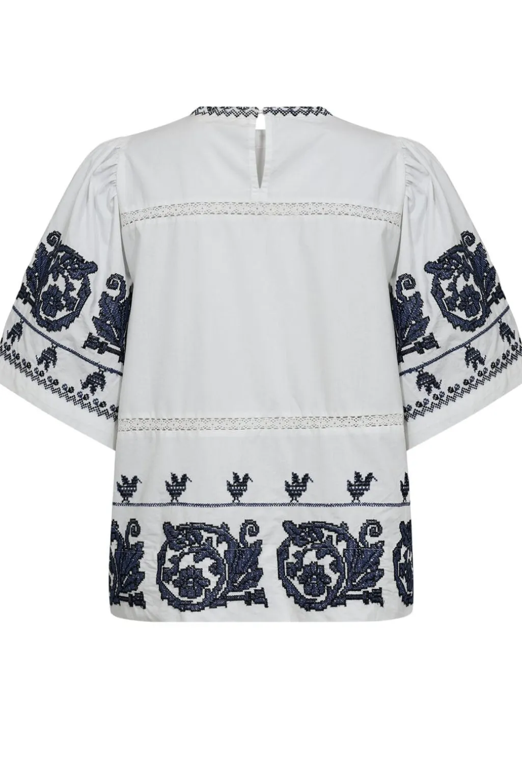 Hvid bluse fra Gossia med blåt broderi. Det detaljerede mønster består af blomster og fugle, der danner bånd hen over stoffet. Blusen har høj hals og korte ærmer.