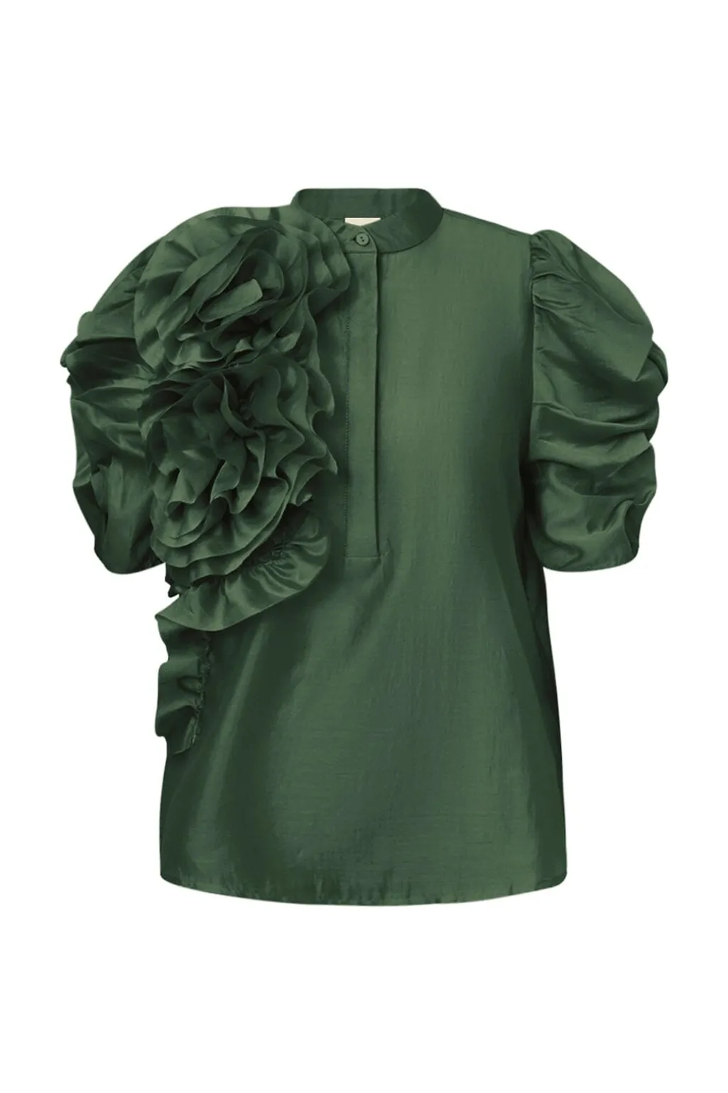 Støvet grøn bluse fra Gossia med dekorative flæser og korte puffede ærmer. Blusen har en løs pasform og høj hals med knaplukning.