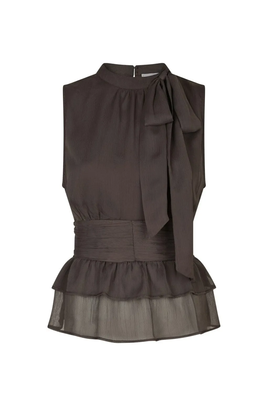 Mørkebrun chiffon-top fra Neo Noir med høj hals og bindebånd. Toppen har en slim fit-pasform og flæser i bunden, der skaber et lag-på-lag-look.