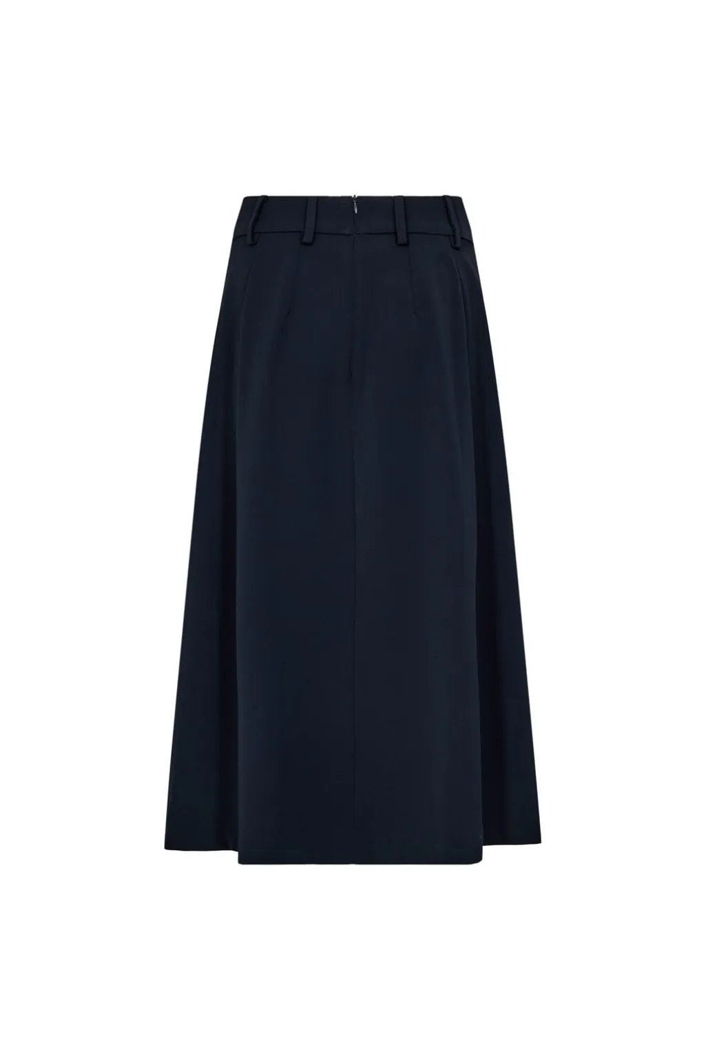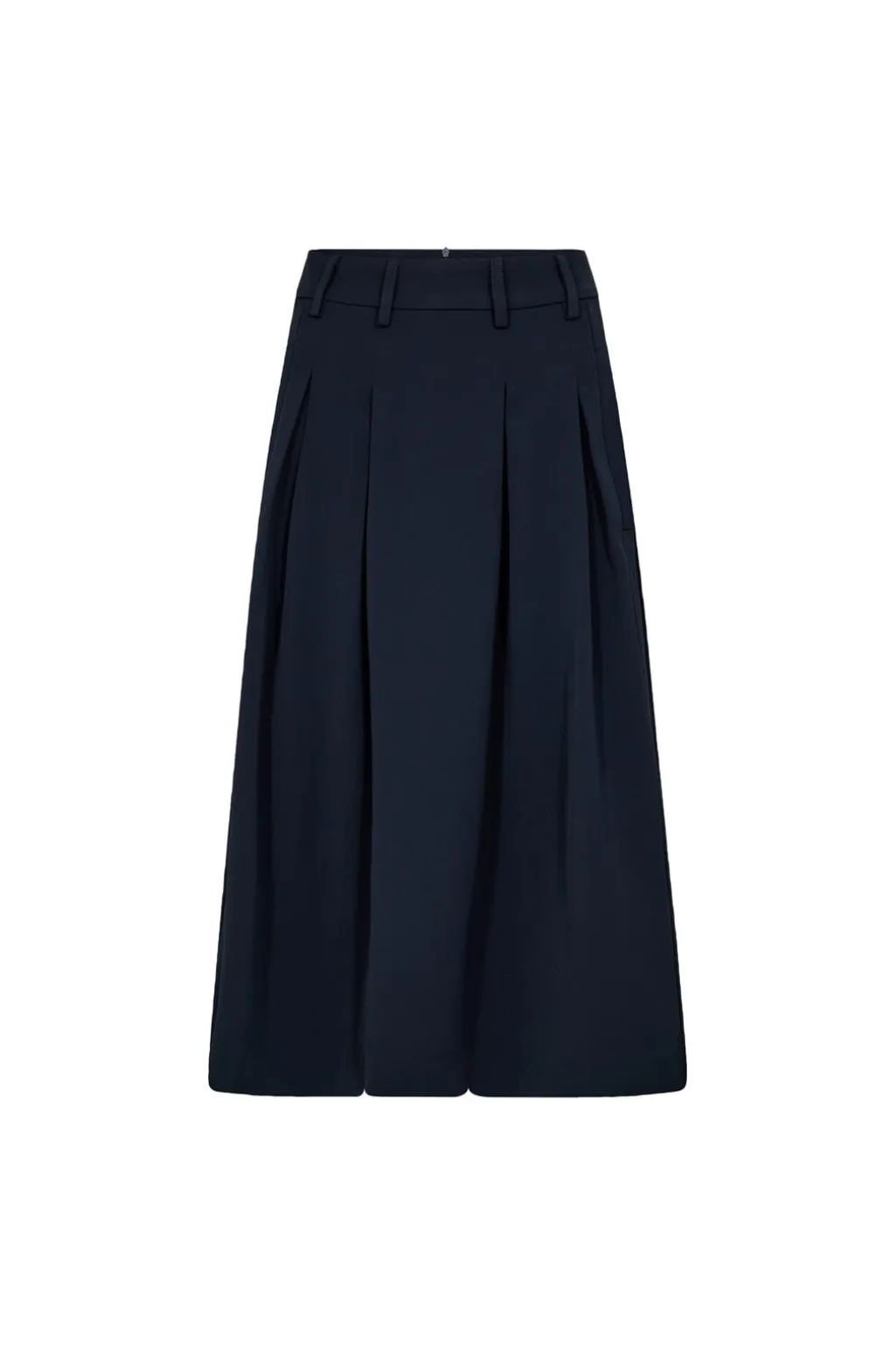 Plisseret nederdel fra Co´Couture i mørkeblå. Nederdelen har plisseringer foran og bæltestropper i taljen, hvilket gør det muligt at bruge bælte.