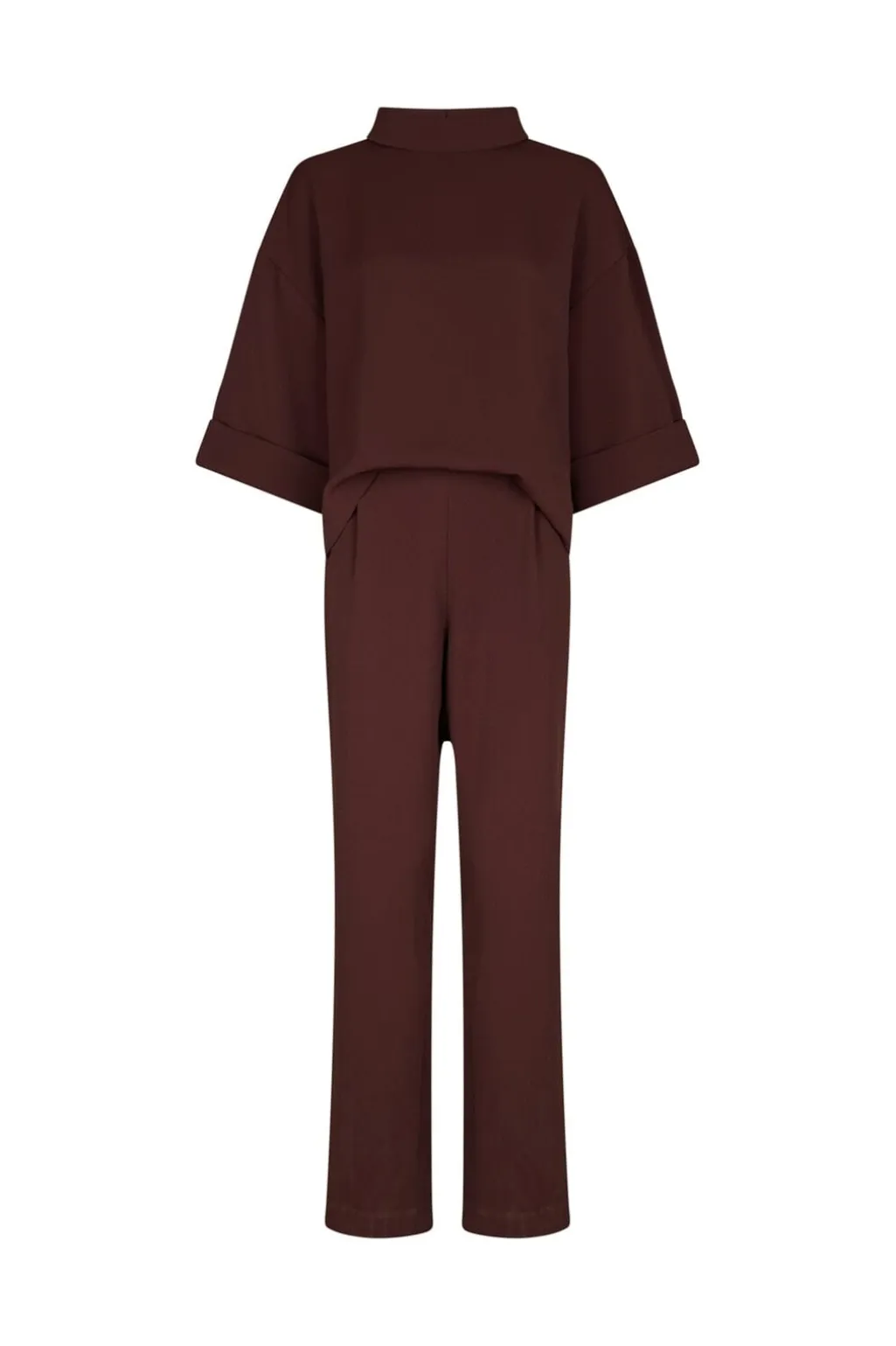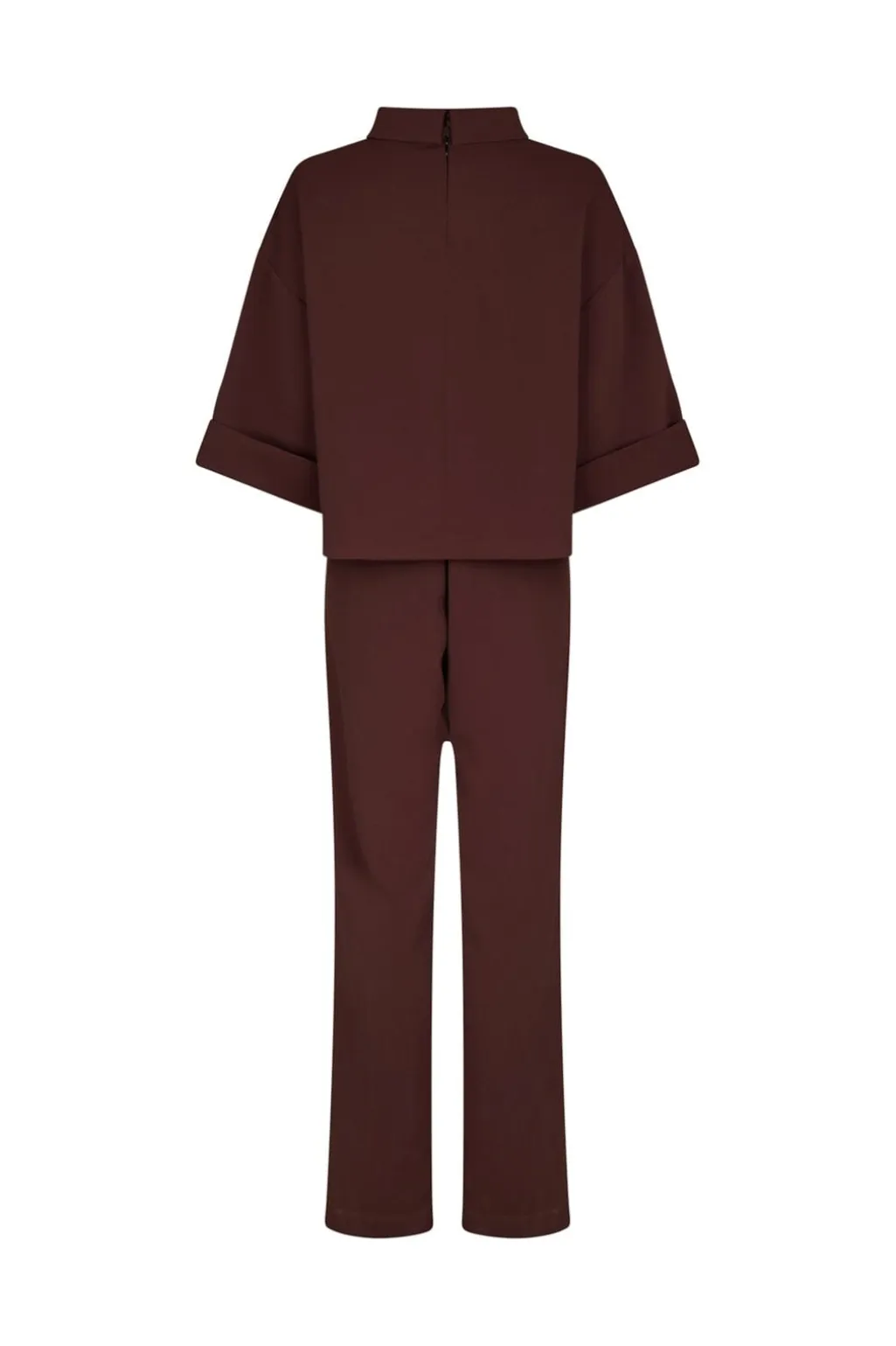 Bordeauxfarvet jumpsuit fra Neo Noir i blød crepe-kvalitet. Den har brede ben, praktiske lommer og en høj halsudskæring. Lynlåslukningen i ryggen gør den nem at tage af og på.