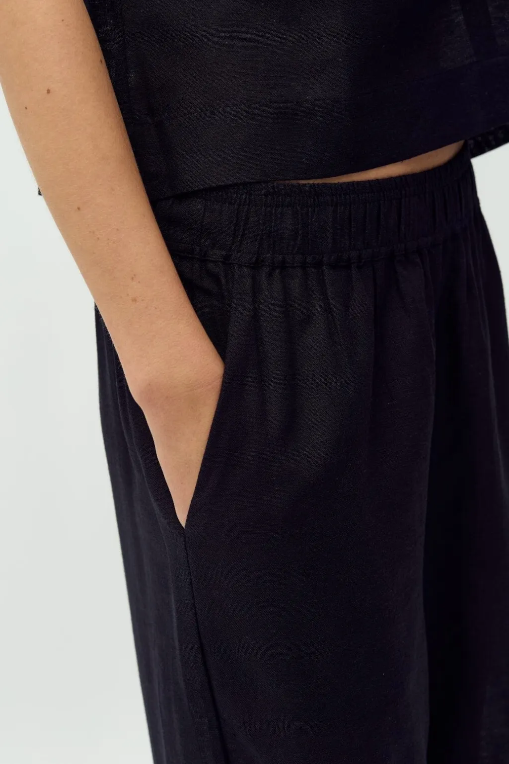 Sorte bukser fra MbyM med vide ben og læglang længde. Bukserne har en elastisk talje og sidelommer, hvilket gør dem praktiske til hverdagsbrug.