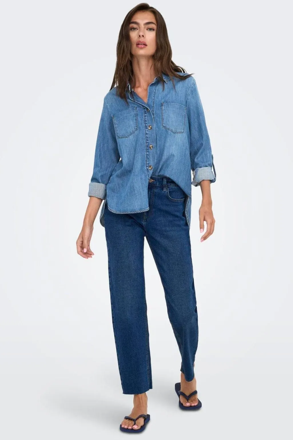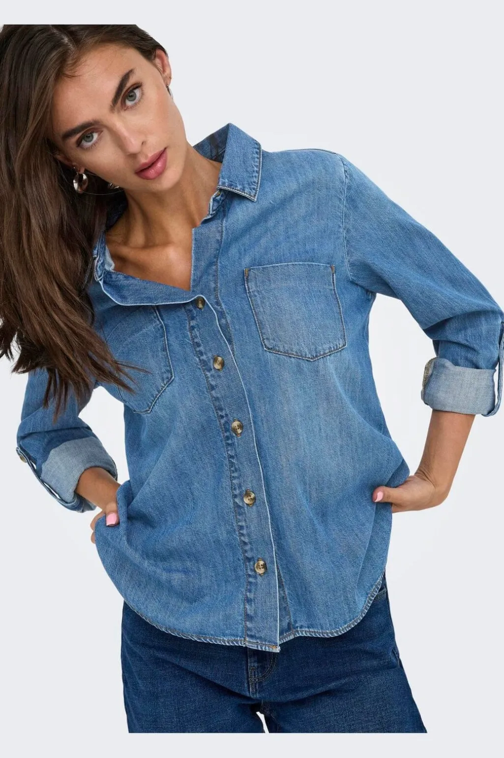 Denimskjorte fra Only i medium blå denim. Skjorten er lavet af 100 % bomuld og har en klassisk skjortekrave med knaplukning foran.