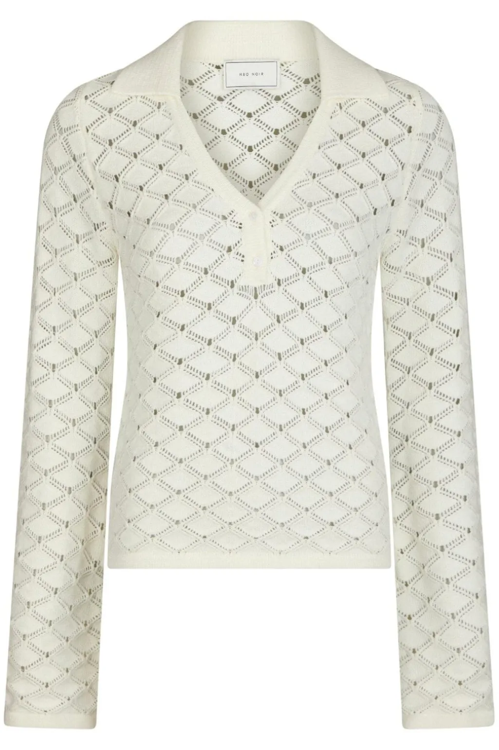 Strikket bluse fra Neo Noir i off-white. Blusen har en V-hals med knaplukning foran og lange ærmer. Det diamantformede strikmønster giver struktur til designet.