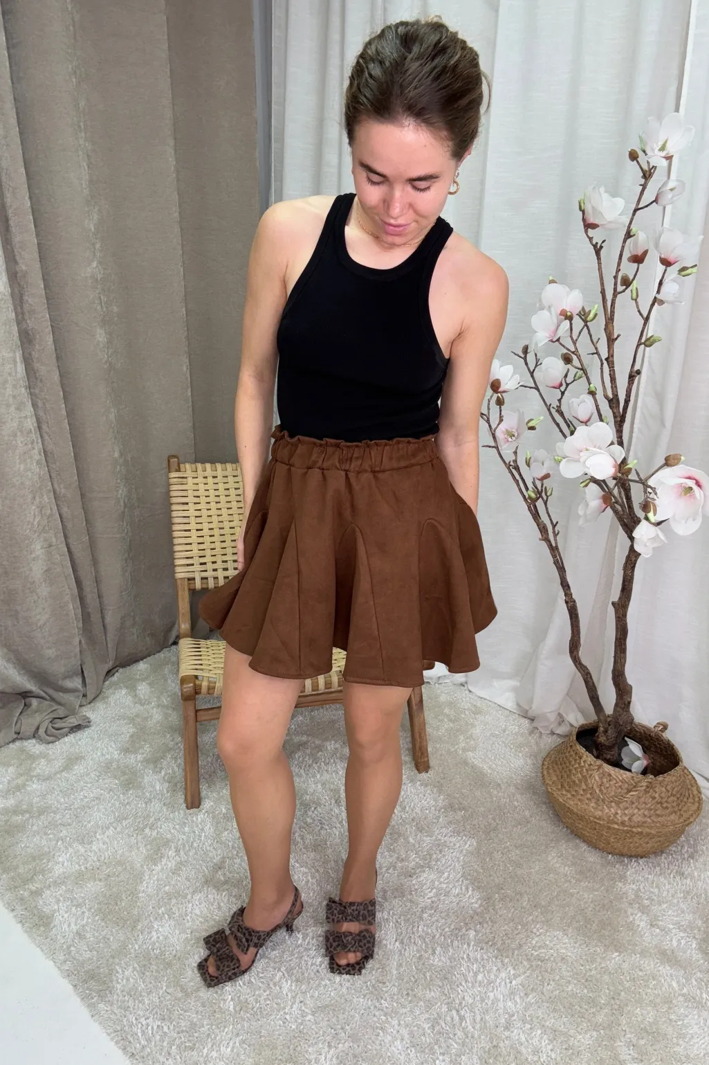 Mørkebrun nederdel fra A-bee med plisserede detaljer. Den korte model har en flared pasform og elastik i taljen, hvilket gør den nem at tage på og af.