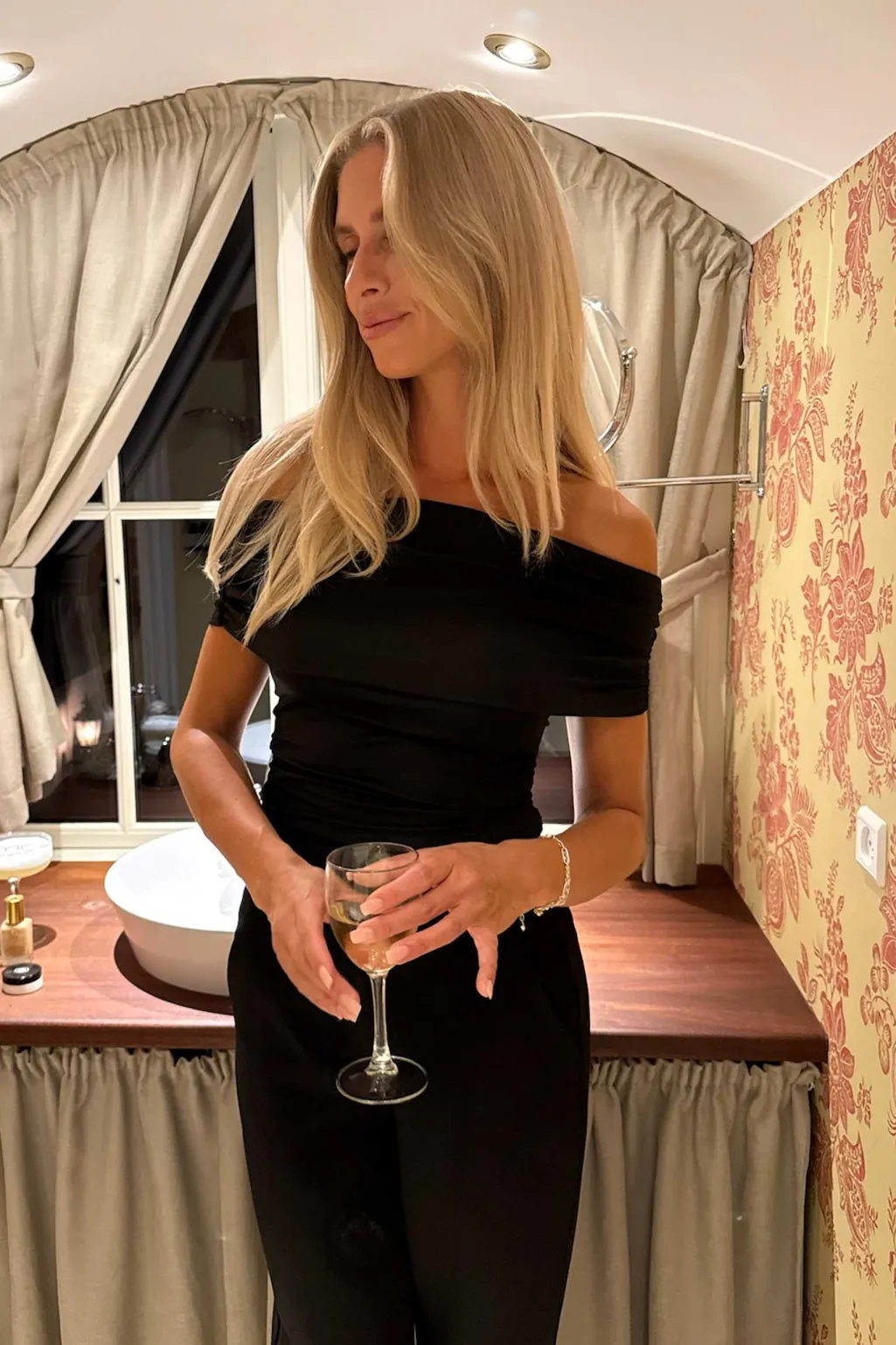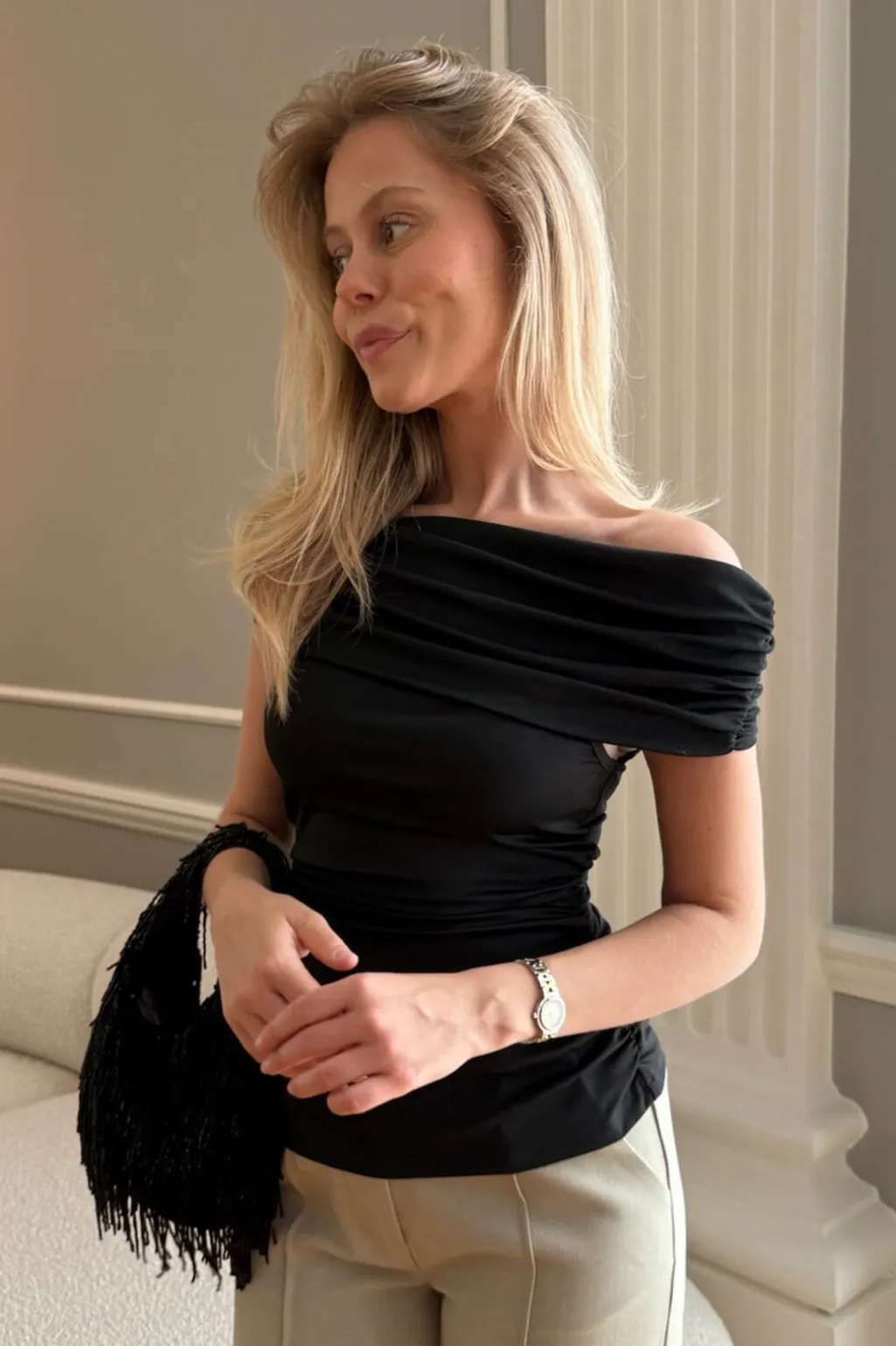 Sort top fra BYIC med off-shoulder-design. Toppen har rynkede detaljer langs siderne og på skulderpartiet. Den tætsiddende model er lavet i strækbart stof.