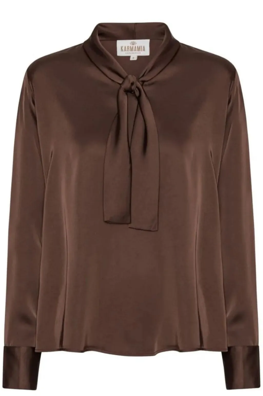 Brun bluse fra Karmamia med høj hals og slipsedetalje. Den bløde triacetatblanding giver blusen et silkeagtigt fald, og den har lange ærmer med manchetter.