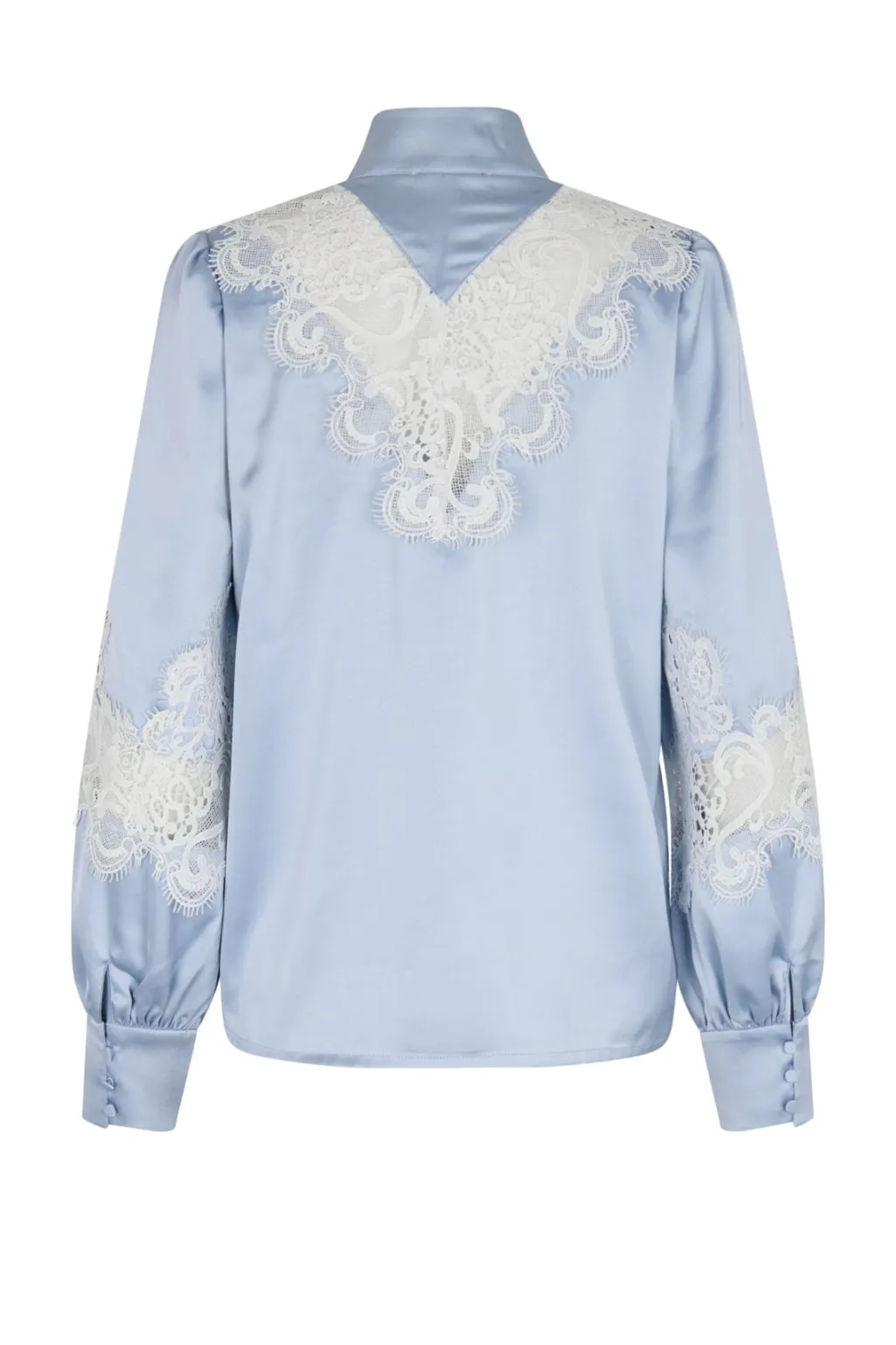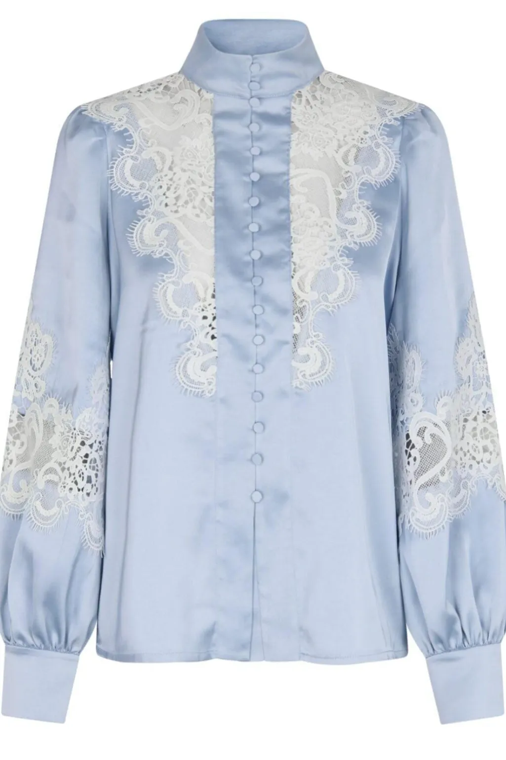 Lyseblå skjorte fra Cras med høj hals og hvide blondedetaljer på ærmerne og fronten. Skjorten har lange ærmer og lukkes med små knapper hele vejen op.