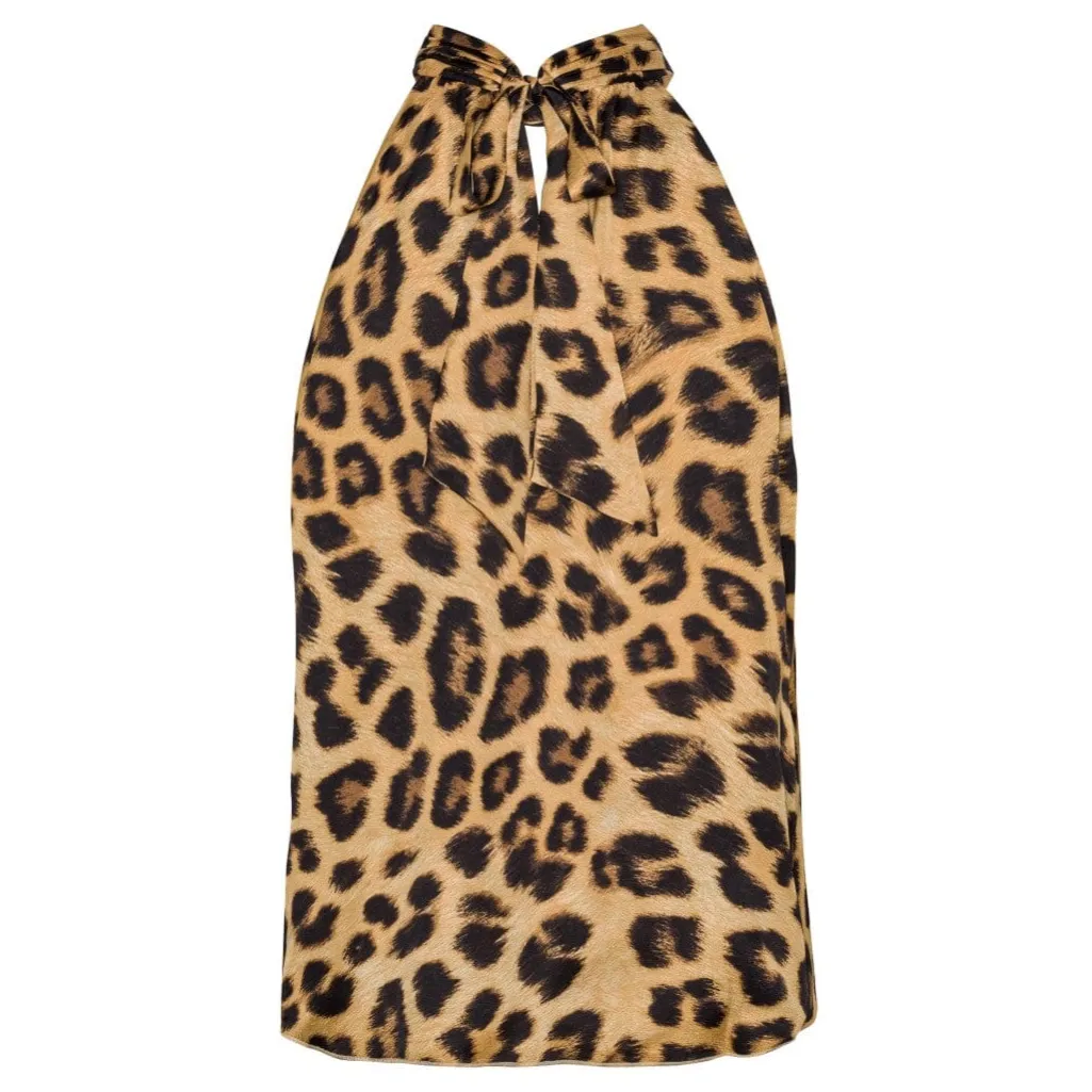 Top fra Karmamia med leopardprint og halterneck-design. Toppen har en løs pasform og en sløjfedetalje ved halsen. Stoffet falder blødt og naturligt.