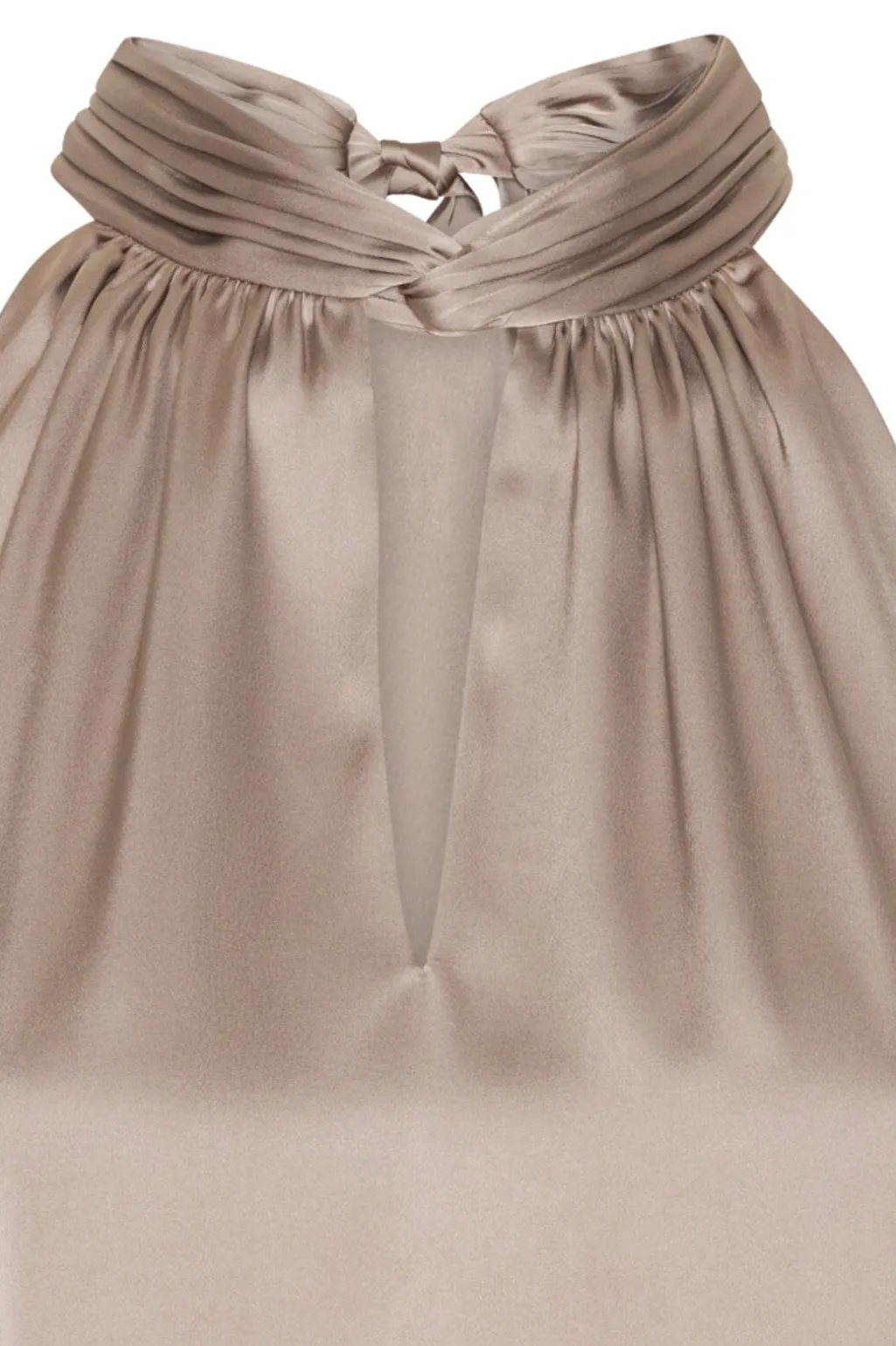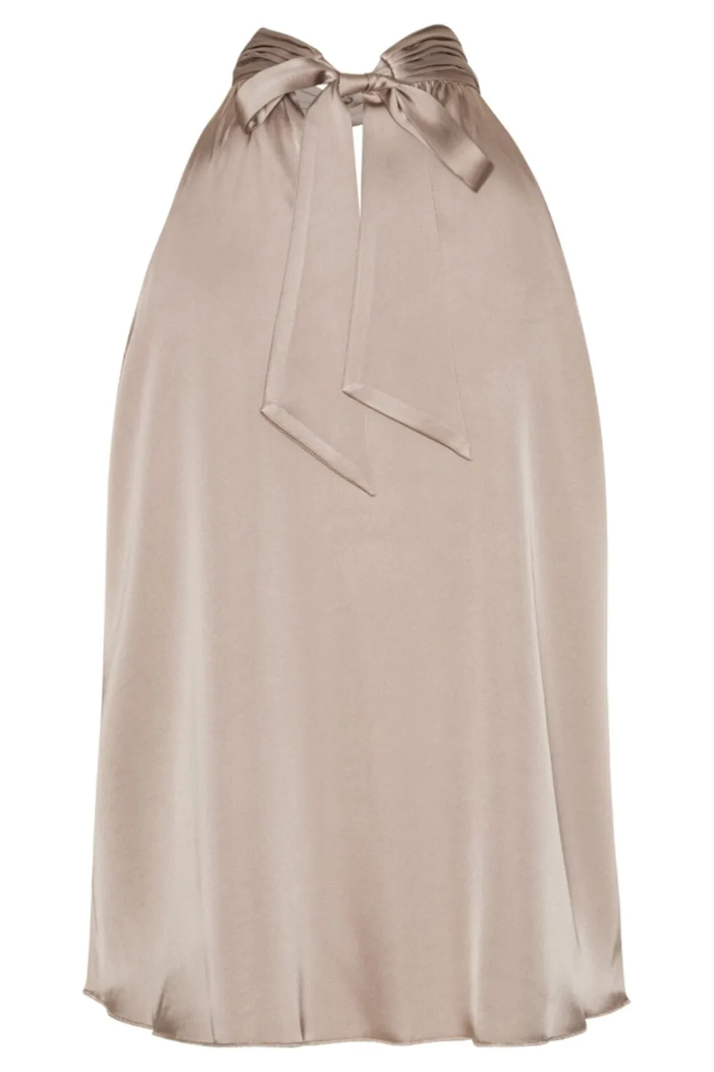 Ærmeløs top fra Karmamia i en varm brun nuance. Toppen har en høj hals med nøglehulskæring og samlet stof ved halsen med bindebånd og flæser.