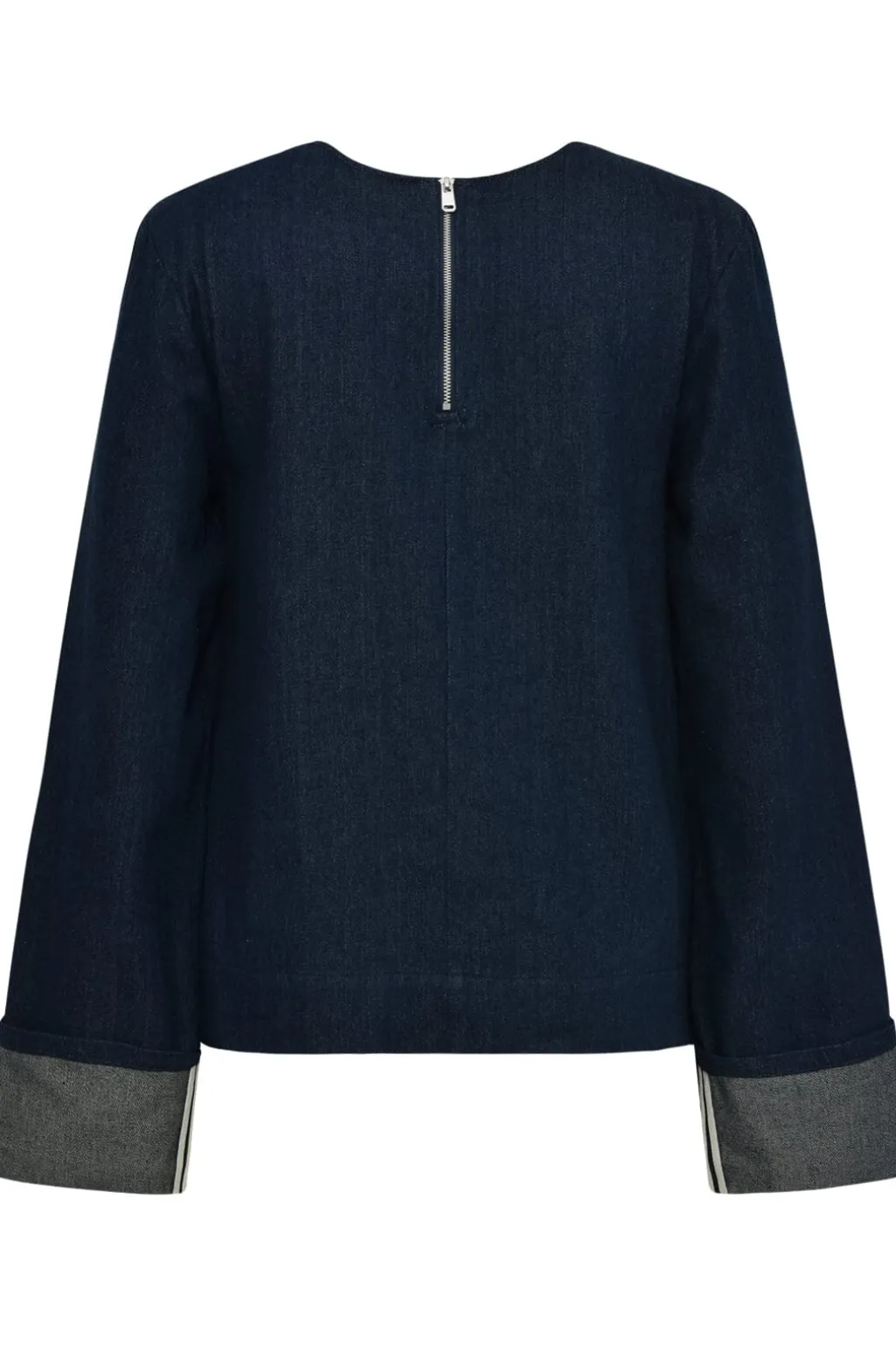 Denimtop fra Global Funk i mørk uvaske denim. Toppen har en rund halsudskæring og lynlås i nakken. Den har lange ærmer og er fremstillet i ren bomuld.